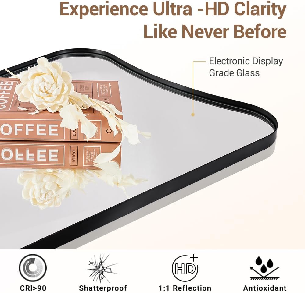 - 【Premium Stainless Steel Craftsmanship】: (N.W:23.88LBS). Crafted from stainless steel metal with oxidation-resistant properties, this mirror for bathroom offers enhanced stability and a longer lifespan. Shatterproof 4mm HD glass is supported by a 9mm MDF backboard (most others just 3mm ), surrounded by a 1/17" gap with the unique curved corner design to give a seamless finish