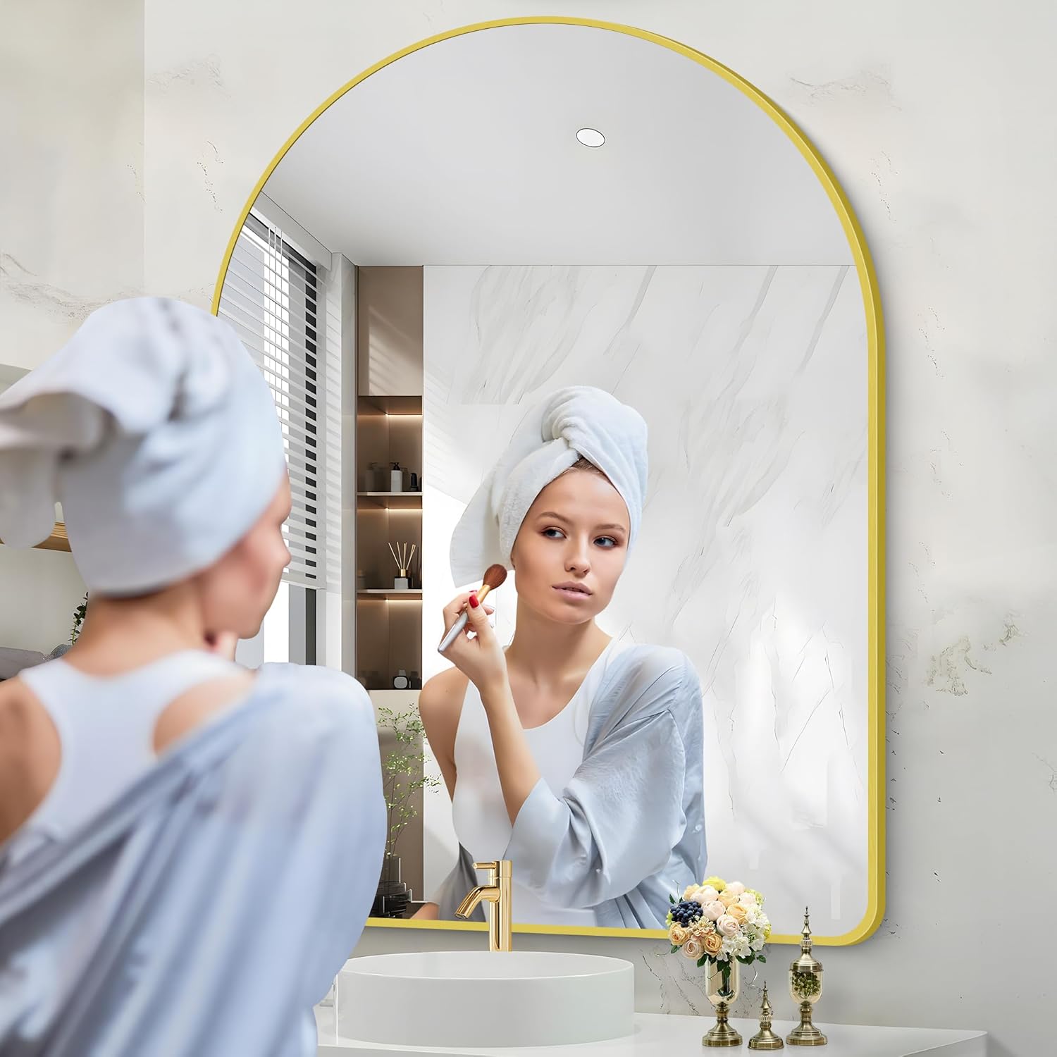 - Widely-Use Decorative Mirror: With gold arched mirror round corner and sleek frame, the wall-mounted mirror looks simple and elegant, fits for any decor style and makes room brighter. Great contemporary mirror for wall decor for over sink, bathroom, bedroom, entryway, living room, Gallery, Hotel, Salon and more.