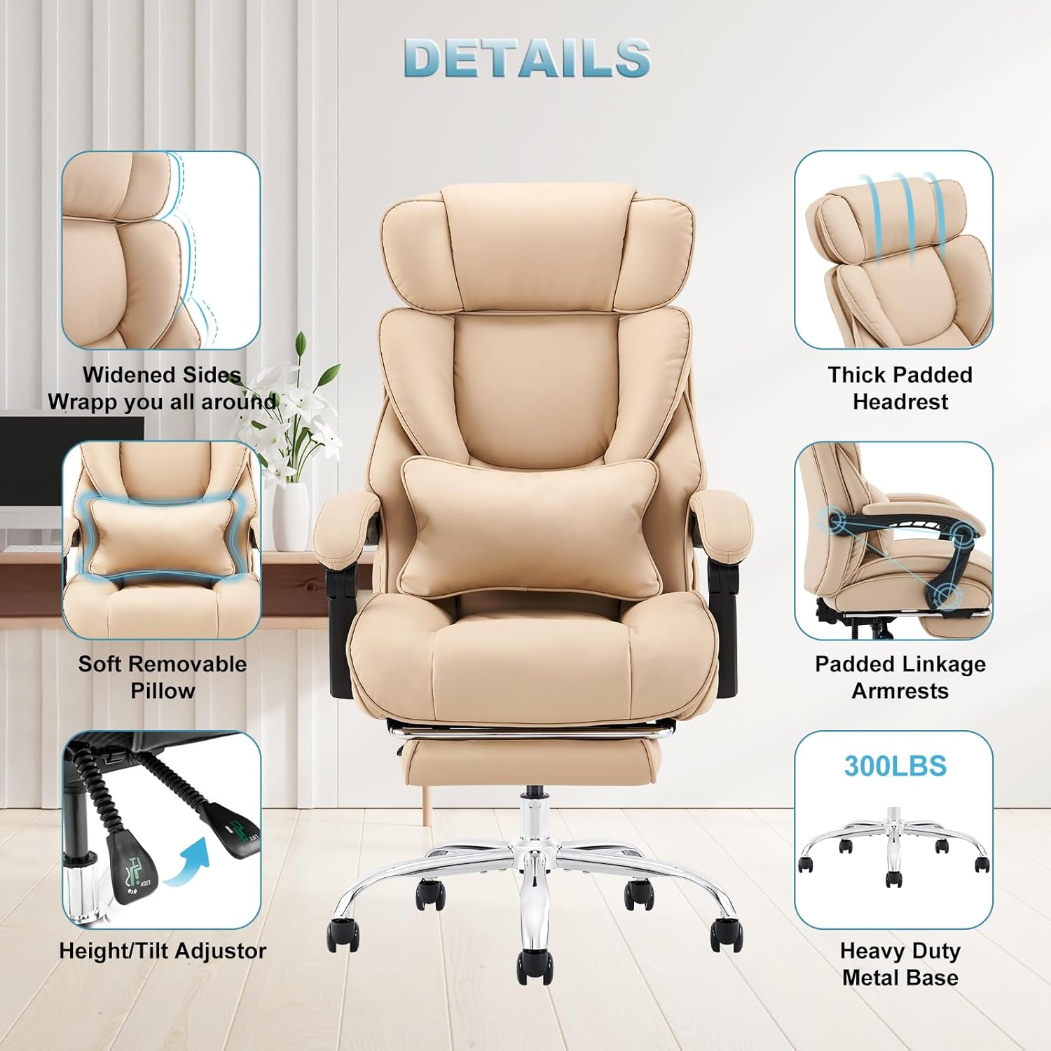 COLAMY Office Chair with Retractable Footrest, Ergonomic High Back Design Executive Computer Desk Chair with Removable Lumbar Pillow, 90-135°Reclining, Thick Bonded Leather, 2 PCs, Khaki
