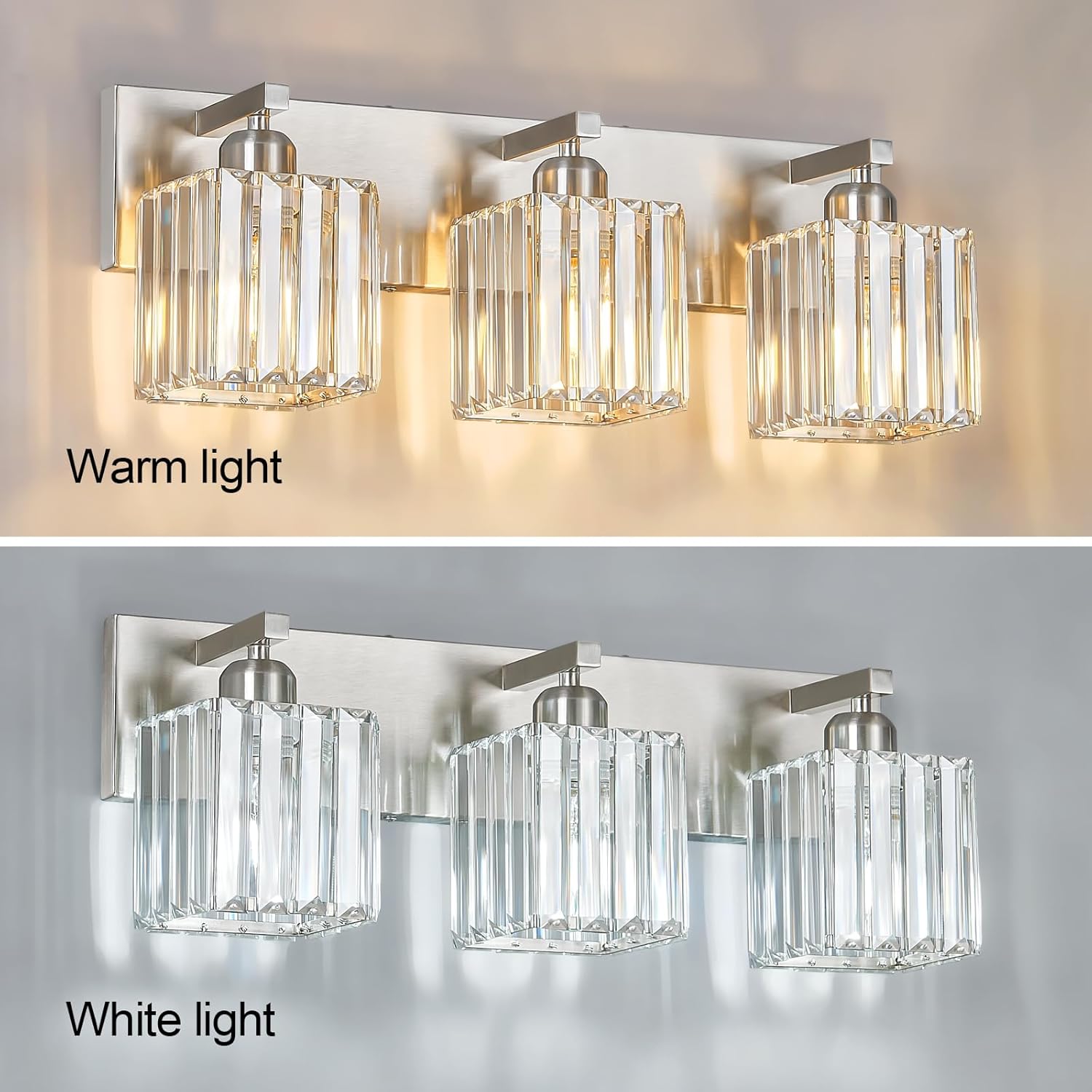 - [High quality manufacturing] Bathroom lights shade is made of clear K9 crystal, base and arm are made of brushed nickel finish, corrosion and moisture resistant, sturdy and durable. Can create a beautiful lighting effect, bathroom vanity lighting simple and luxurious design shows your taste.