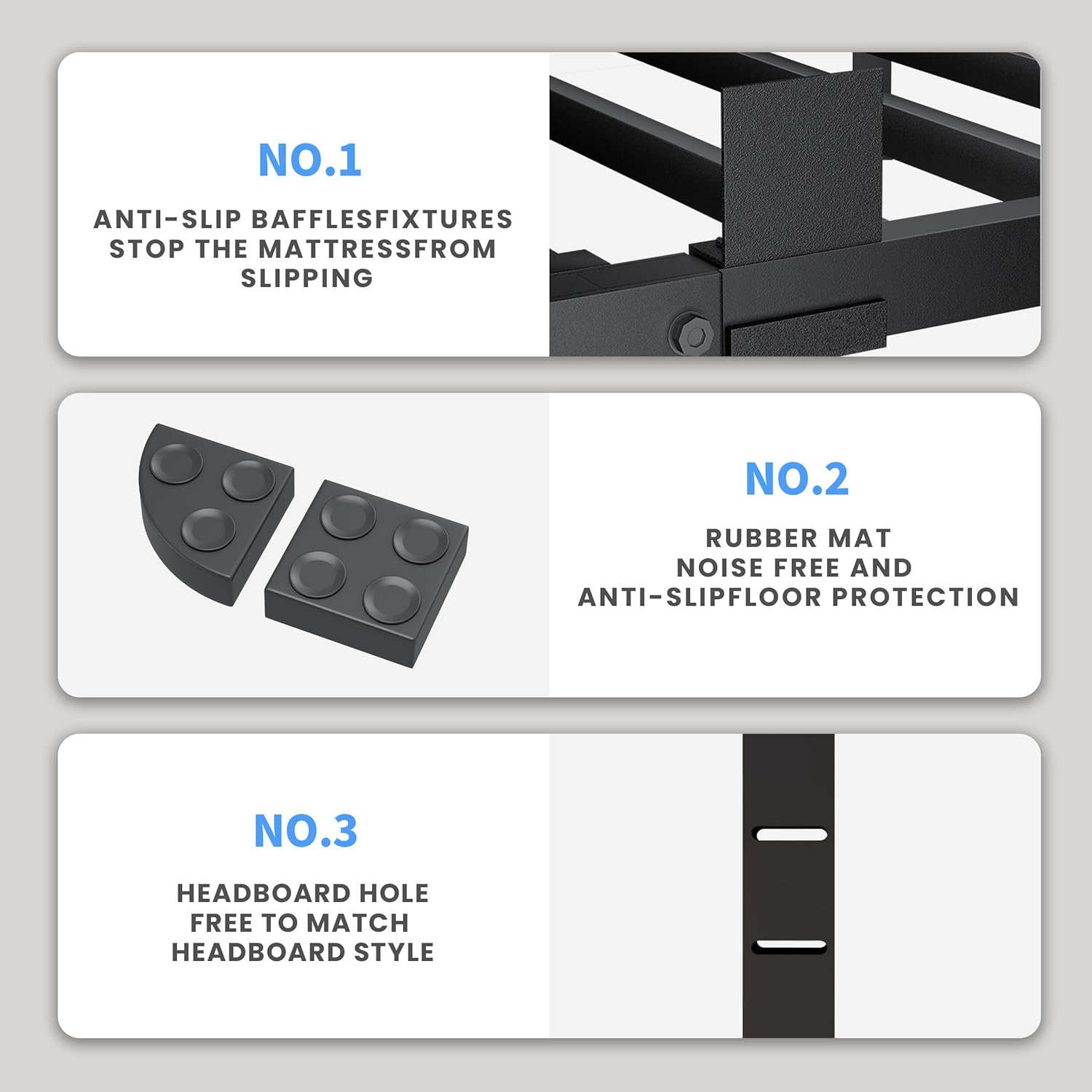 - 4 MATTRESS STOPPERS: The bed frame comes with 4 mattress stoppers that secure the mattress to prevent sliding