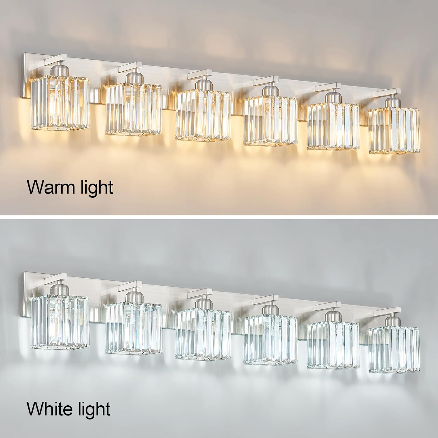 - [High quality manufacturing] Bathroom lights shade is made of clear K9 crystal, base and arm are made of brushed nickel finish , corrosion and moisture resistant, sturdy and durable. Can create a beautiful lighting effect, bathroom vanity lighting simple and luxurious design shows your taste.