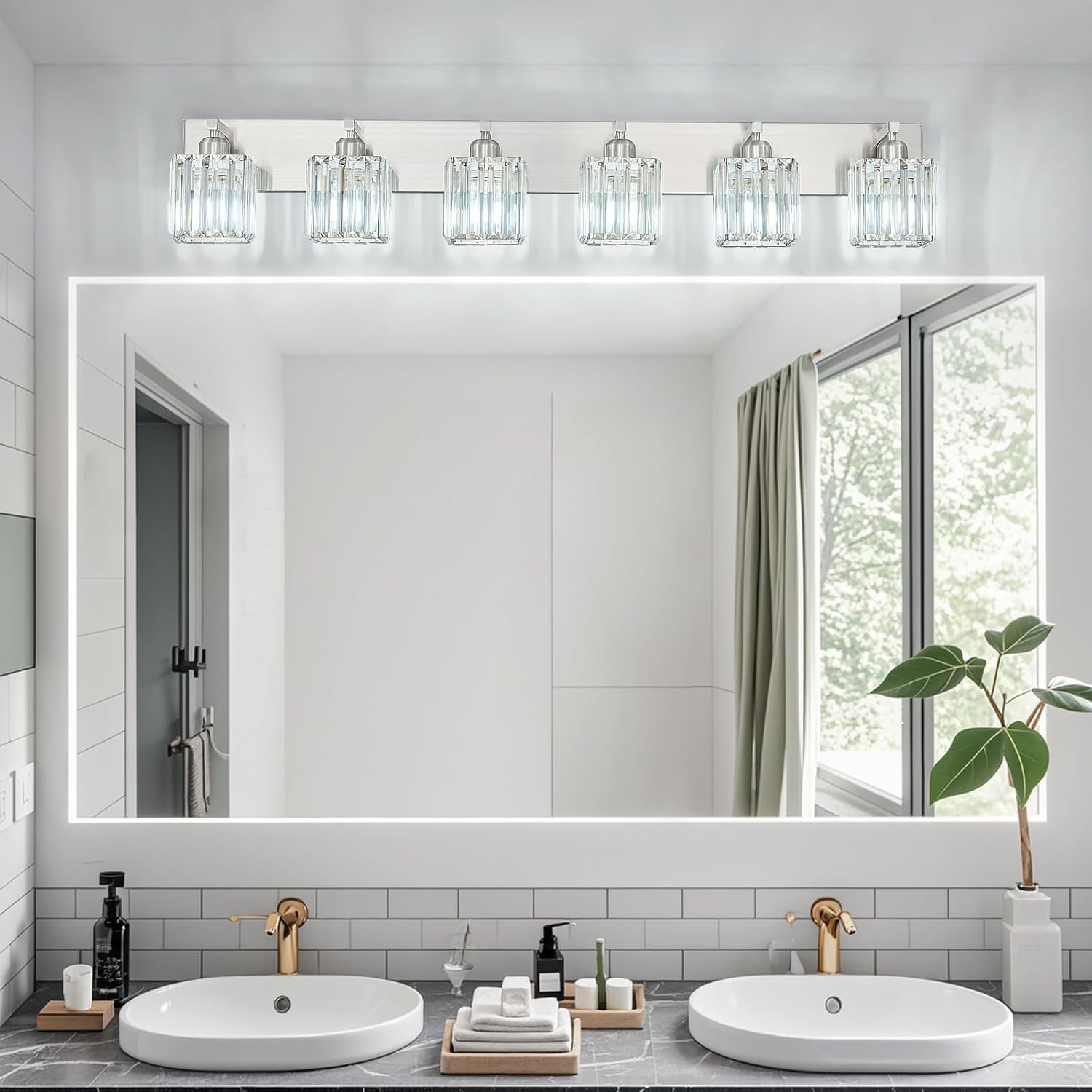 Modern Vanity Light 6-Lights Brushed Nickel Vanity Light Crystal Bathroom Wall Light Bathroom Light Fixtures