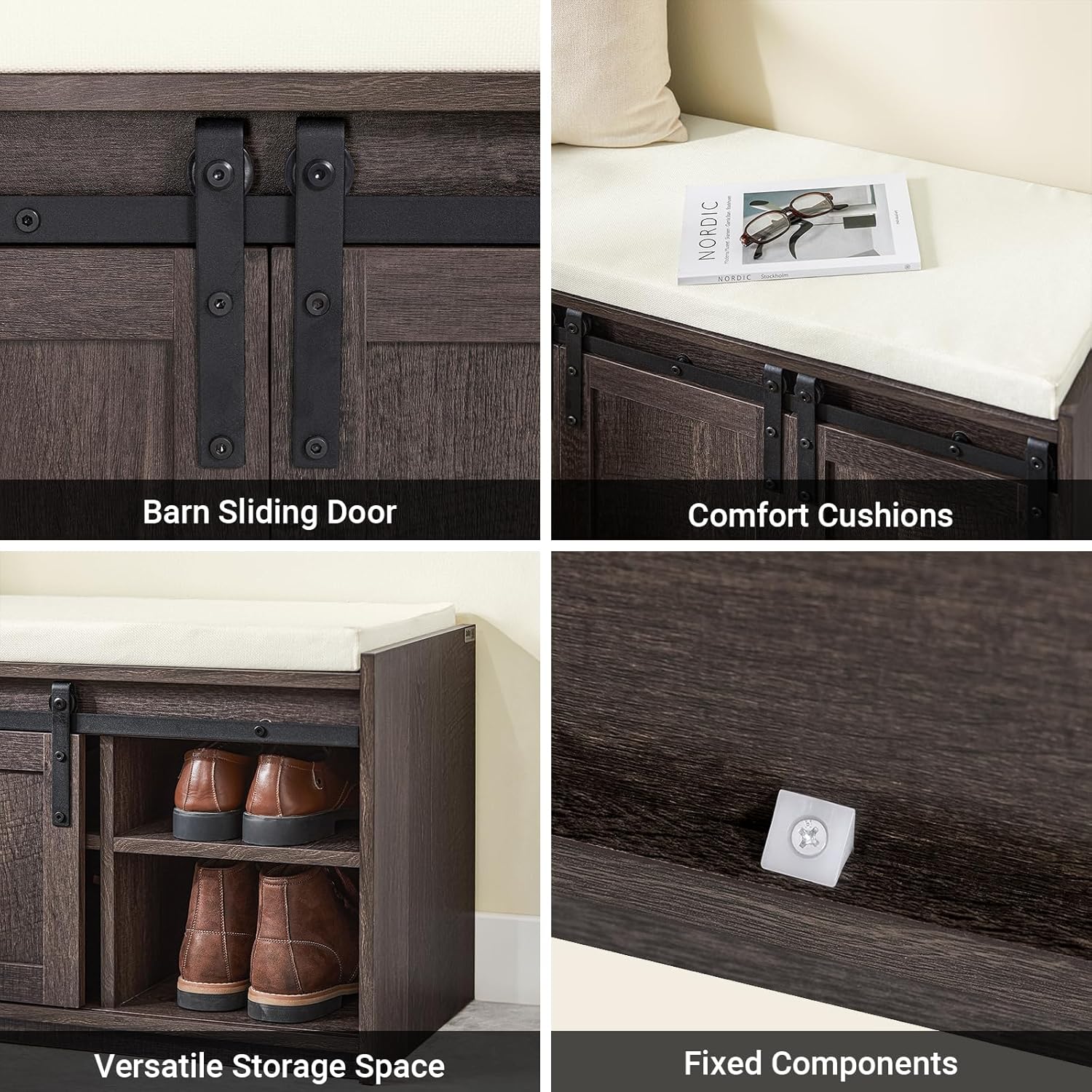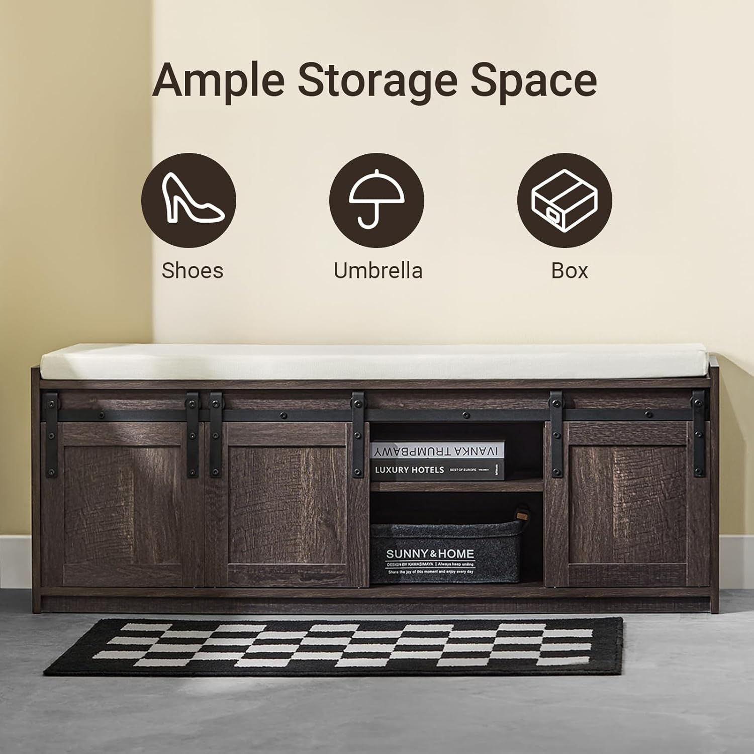 - [Features of Shoe Storage Bench]: Farmhouse Sliding Barn Doors Bench Entryway with Sliding Doors and Ample Storage. 3 compartments beneath seat area, one shelf and one drawer in the middle compartment, internal adjustable shelf in both right and left compartment, providing ample storage space for you. Allowing you to customize the height for optimal organization.