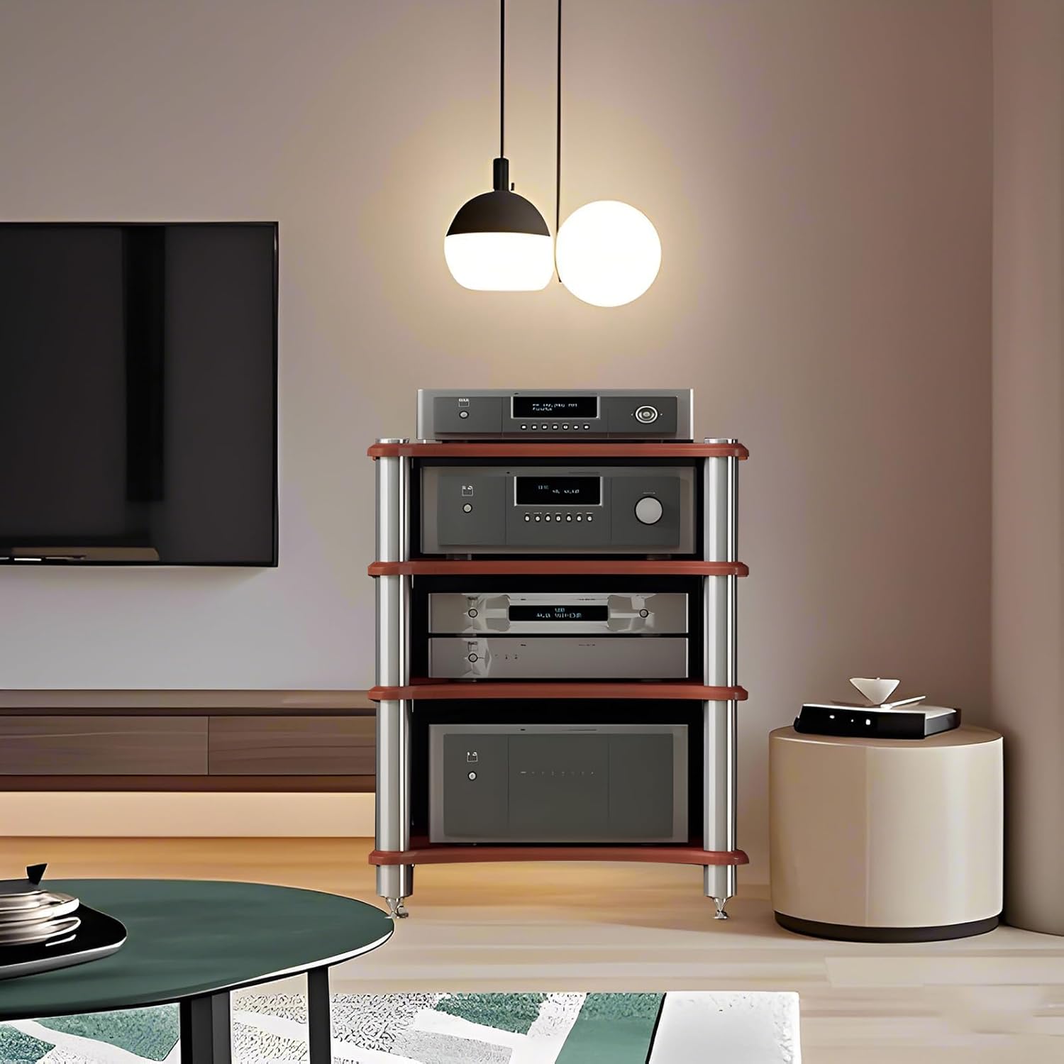 - Multi-Function Stereo Cabinet Audio Rack: This shelf for record player is perfect for corners or remaining space. Except place this in a theater room to store your stereo component you can also use it as a printer stand for my office. What's more, you can use 4-Tier AV media stand as a TV stand in a small bedroom