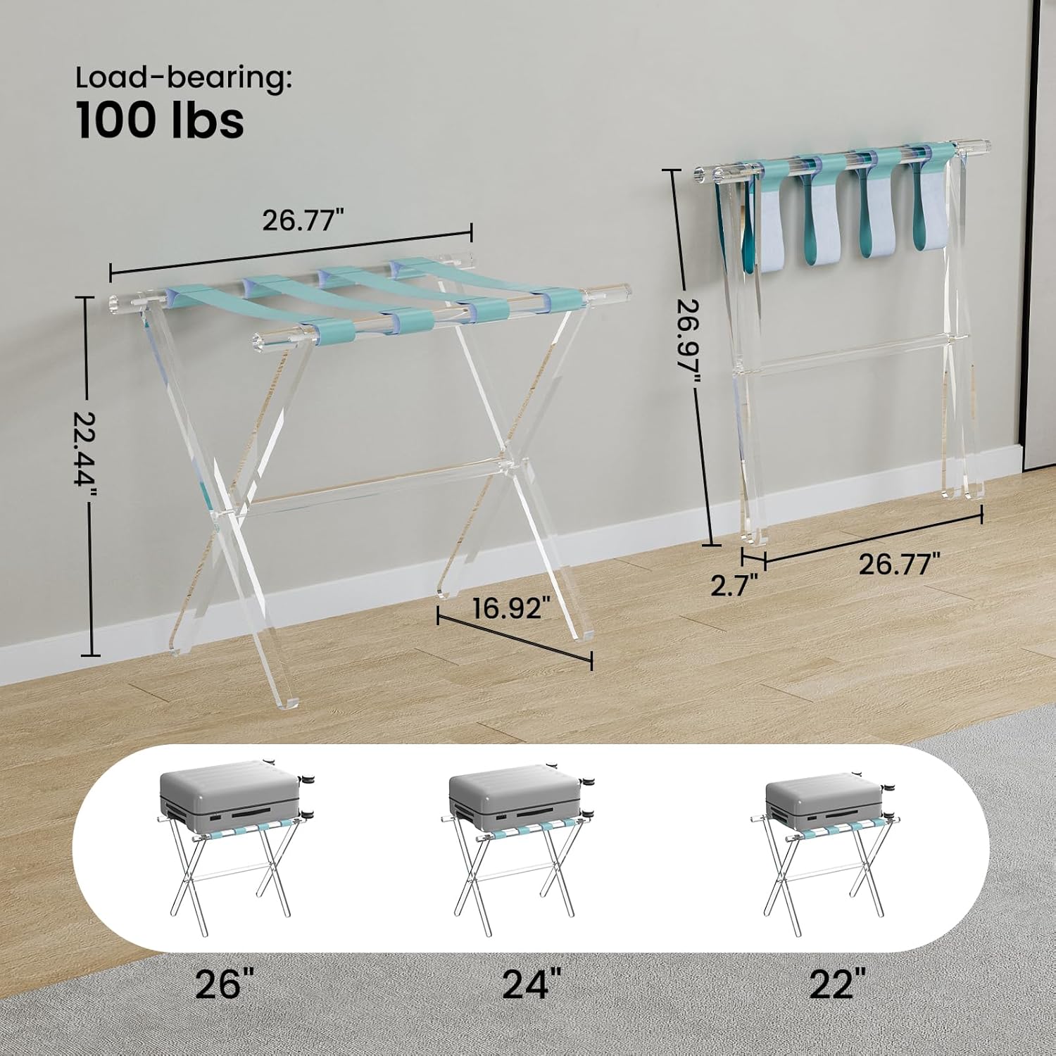 Sumerflos Acrylic Luggage Rack for Guest Room - Foldable Suitcase Stand with Leather Straps for Bedroom Living Room Hotel Heavy-Duty, Holds up to 50-100 lb lightweight Space Saving (Blue & Handle - 1 Pcs)