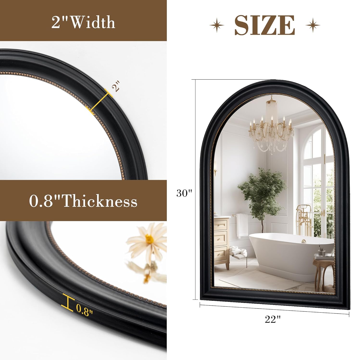 Axeman 22x30 Arched Wall Mirror, Decorative Bathroom Mirror, Traditional Vintage Wall Mounted Mirror with Beaded Frame for Accent Living Room Vanity Bedroom Entryway, Black