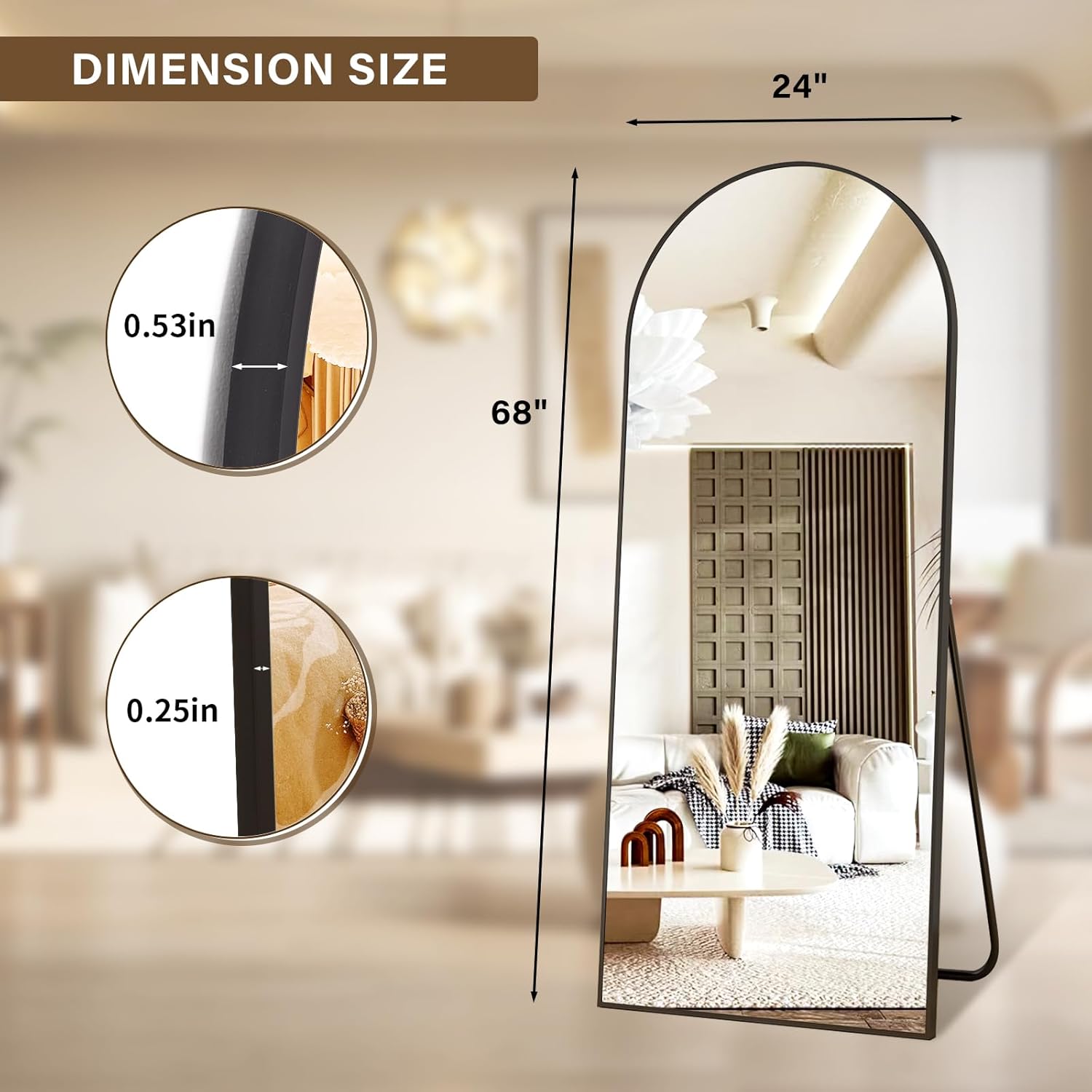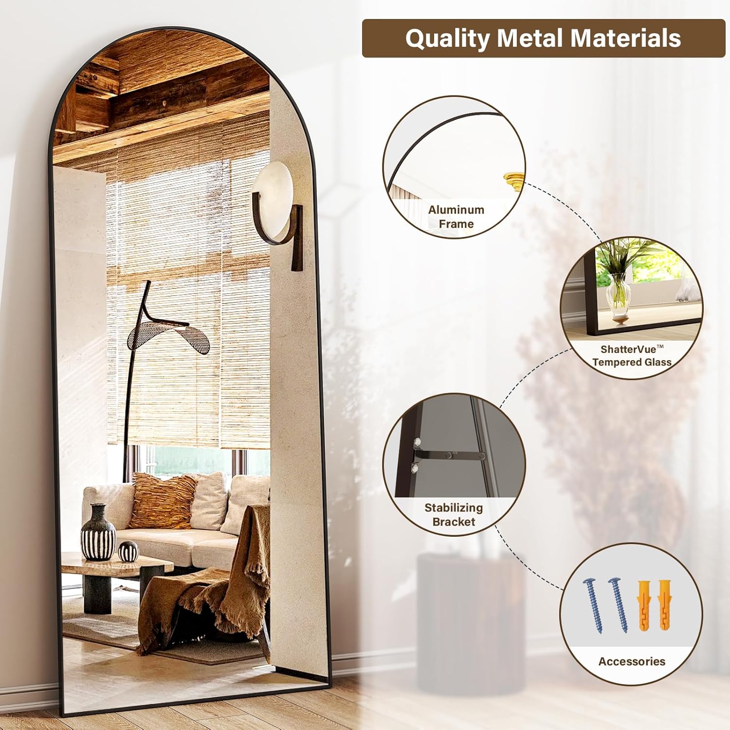 - Aluminum Alloy Frame : This arched metal mirror is crafted with a durable, high-quality frame that combines style with sturdiness. The arched floor length mirror is designed with a thin, yet sturdy, arch gold mirror full length frame, making it a timeless addition to your home. With a classic black/gold/silver finish, this arched body mirror complements a variety of decor styles, from modern to antique-inspired spaces
