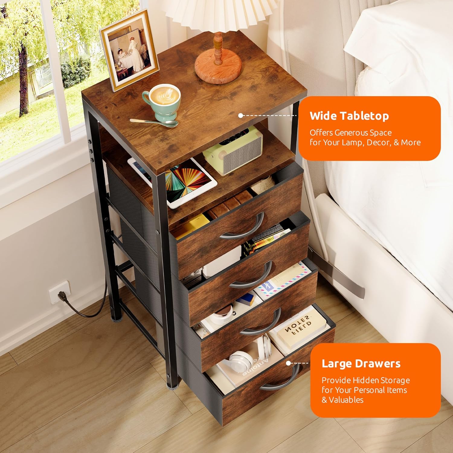 - Spacious Storage: This bedroom night stand offers 4 fabric drawers to store your personal items and valuables, while the wide tabletop and open shelf provide extra space for books, speakers, and other accents that add style to your space