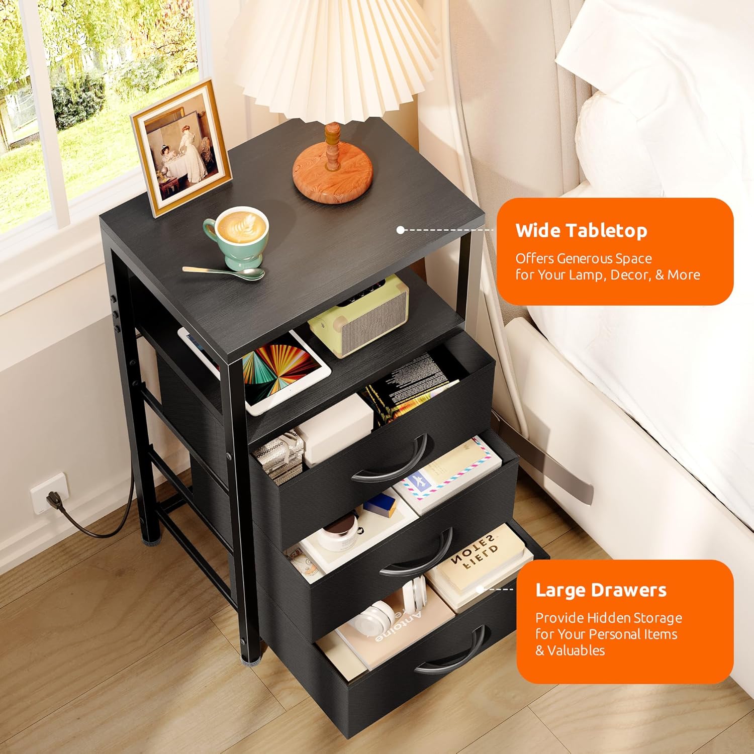 NightStand Bedside Charging Table Bedroom - Night Stand with Charger Station, Black Modern Bed Side End Table with Open Shelf & 3 Fabric Drawers, USB-C USB Ports & AC Outlets for Dorm, Living Room