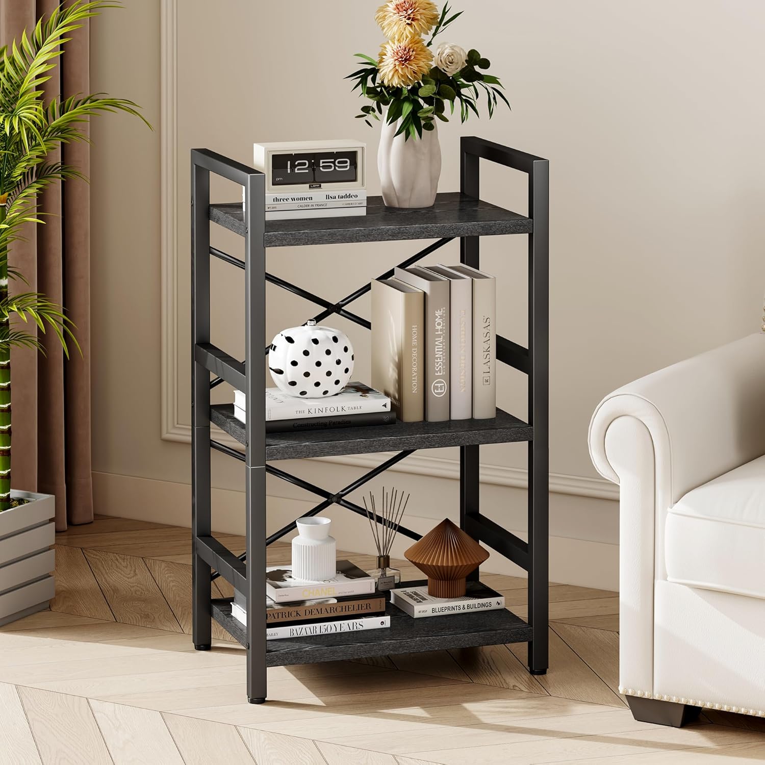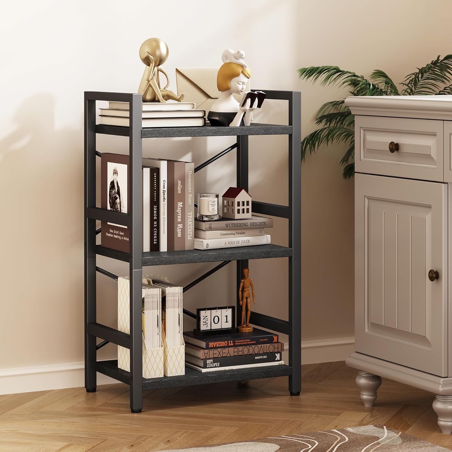 Homeiju Bookshelf, 3 Tier Industrial Bookcase, Metal Small Bookcase, Rustic Etagere Book Shelf Storage Organizer for Living Room, Bedroom, and Home Office(Black) Patent Pending D29873033