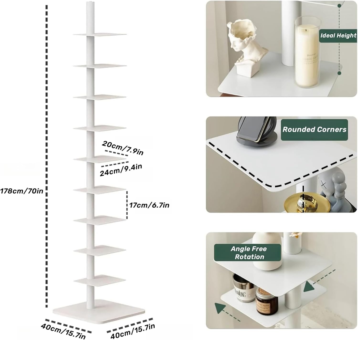 - EASY INSTALLATION: The vertical bookshelf tower is extremely simple to install without any tools. After you open the package, install it from bottom to top, and you can rotate the angle at will, allowing you to experience the fun of DIY to the fullest.