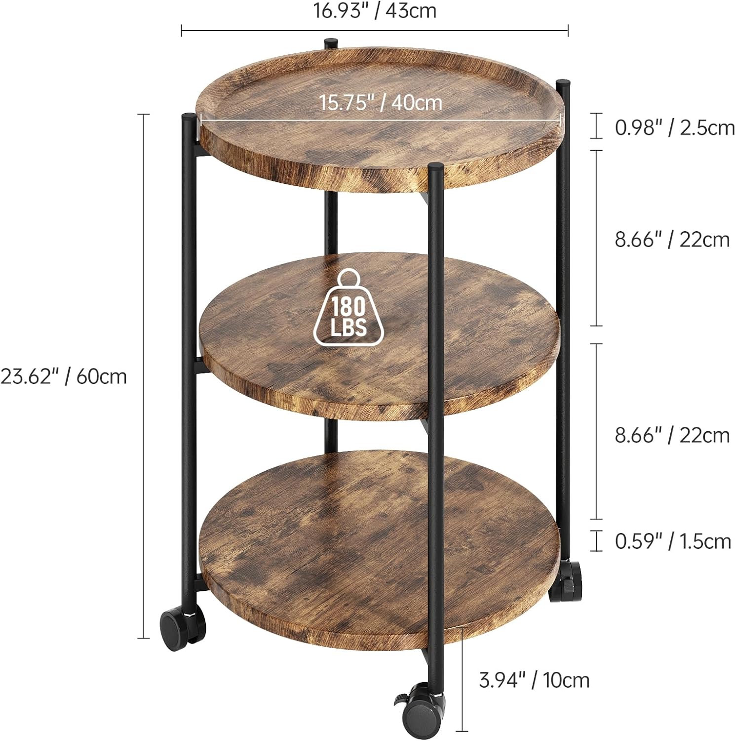 Side Tables Living Room, 3-Tier Modern End Table with Wheels, Small Side Table Nightstand Bedside Table for Living Room, Bedroom, or Small Spaces-Rust Brown