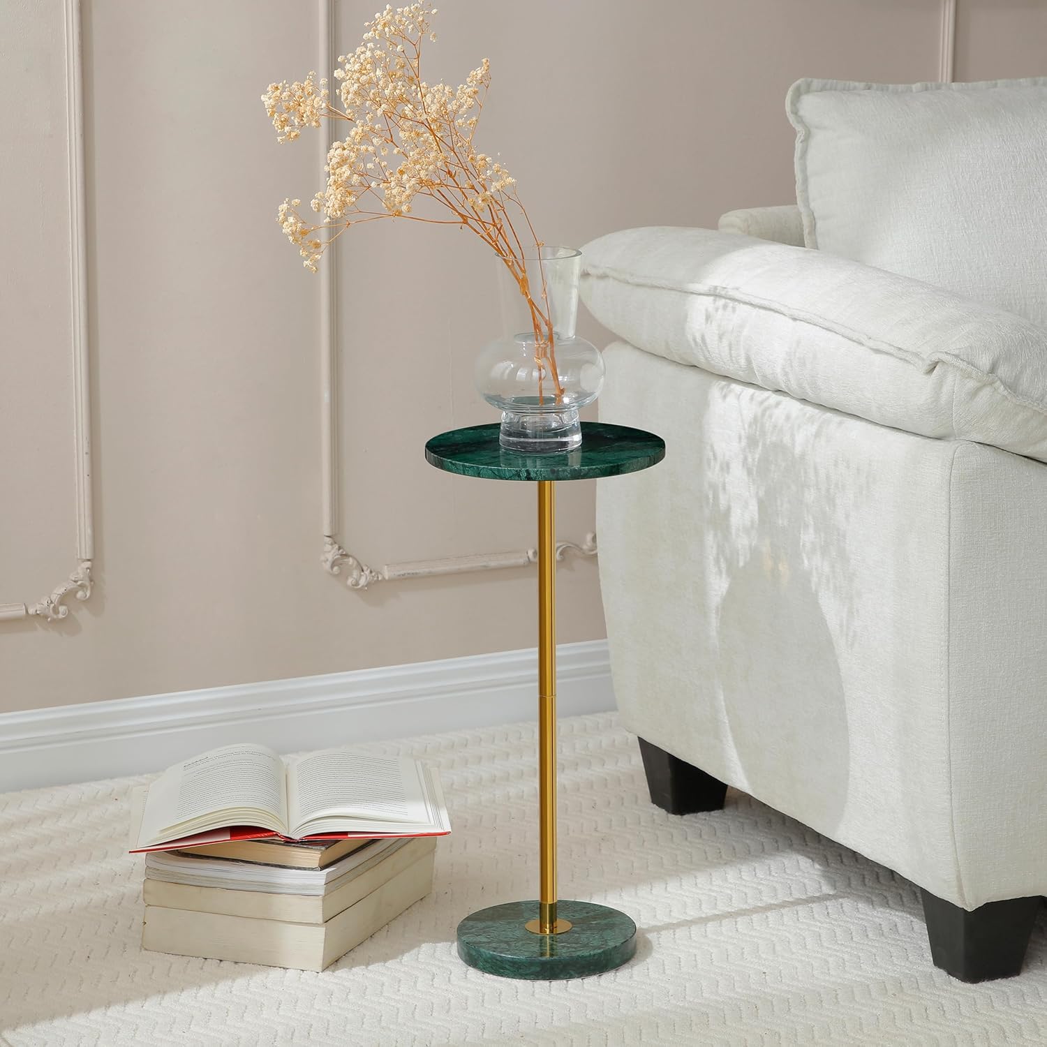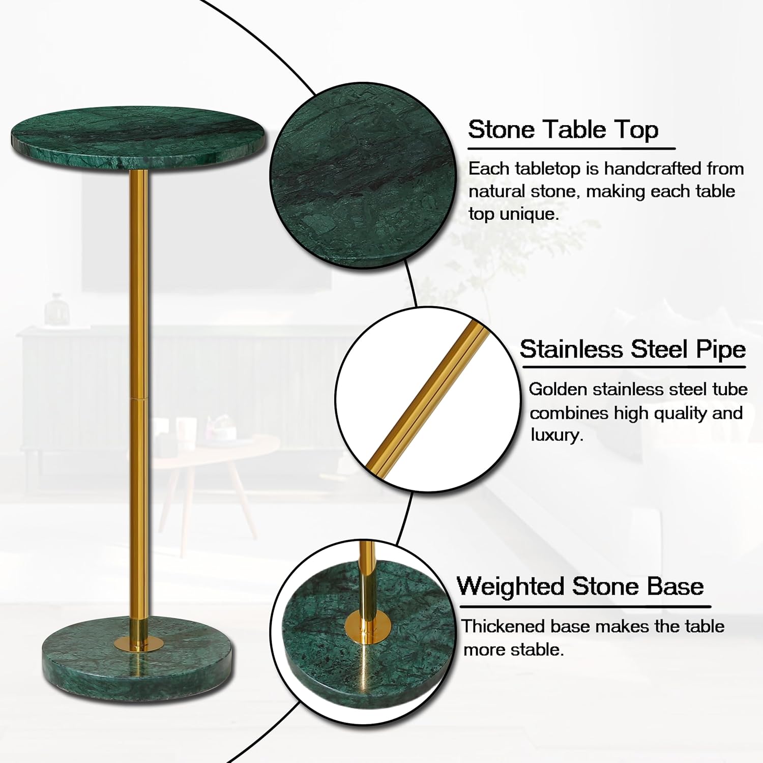 Φ9.8-inch Marble Round Drink Table, Stone Finish Pedestal End Table for Living Room, Weighted Base Small Accent Side Table for Small Space - Emerald Green
