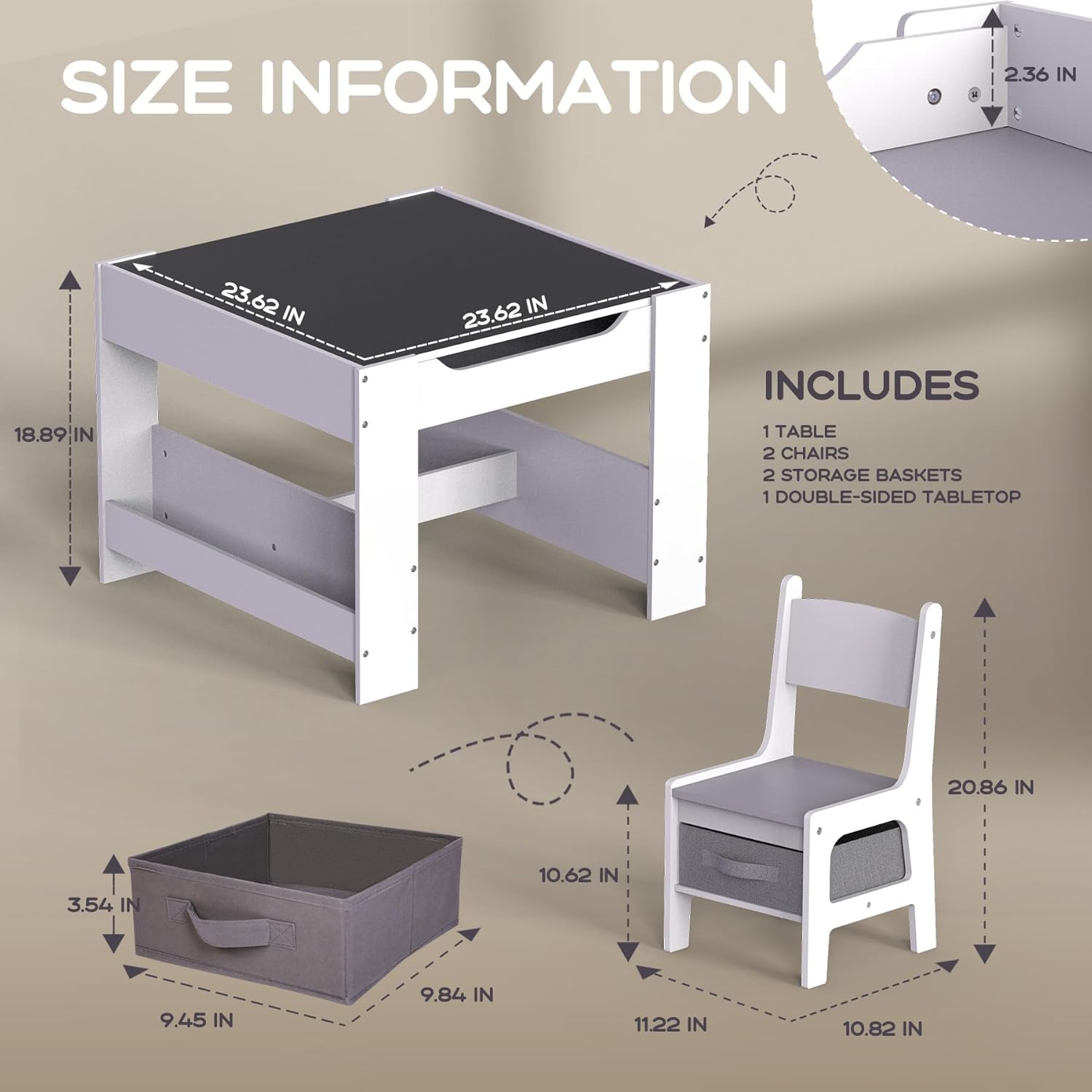 - 4- in-1 STURDY & SAFE MATERIAL: 4- in-1 Toddler table and chair set are made of solid and non-toxic materials, safe to accompany your kid every happy day. The multi-layer tabletop of this table allows for easy changes according to children's needs, whether it's having lunch, playing with toys, toddler learning activities, or drawing on the blackboard. Kids table and chairs features side storage compartments for storing magazines, books, and more. Each chair also includes storage pockets.