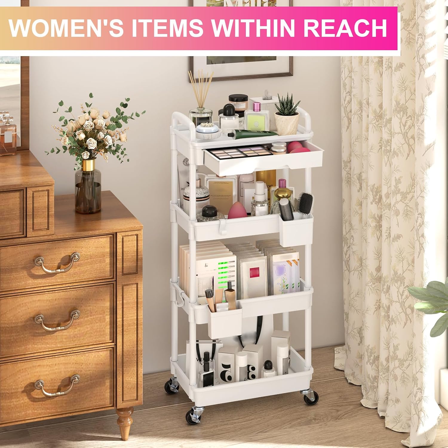 - 【Versatile Rolling Organizer Cart】Based on the above characteristics, you can treat our utility cart as a bathroom cart, craft cart, snack cart, beauty cart, art cart, book cart, baby diaper cart, lash cart, bedside cart, kitchen storage cart, nail cart, makeup cart, nursery cart, pedicure cart, laundry room cart for your home, garage, office, classroom or small apartment.
