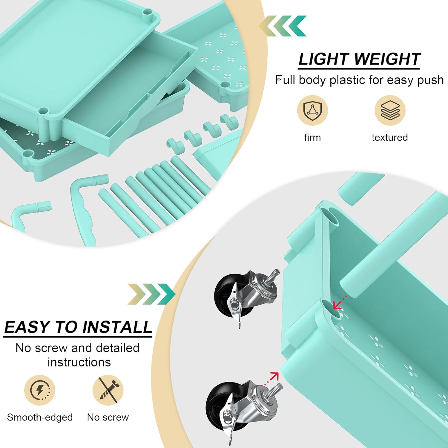 - 【360° Swivel and Lockable Wheels】Our rolling carts with wheels is set up with safety protection features. The rolling cart organizer has easy-to-push handles on both sides, and the wheels swivel 360° for a silky-smooth push and easier maneuvering around corners. The 4 wheels are made of thick metal as well as durable plastic with smooth edges that won't scratch your floors. 2 of casters lock in place will keep the blue rolling cart stable and stationary when needed.