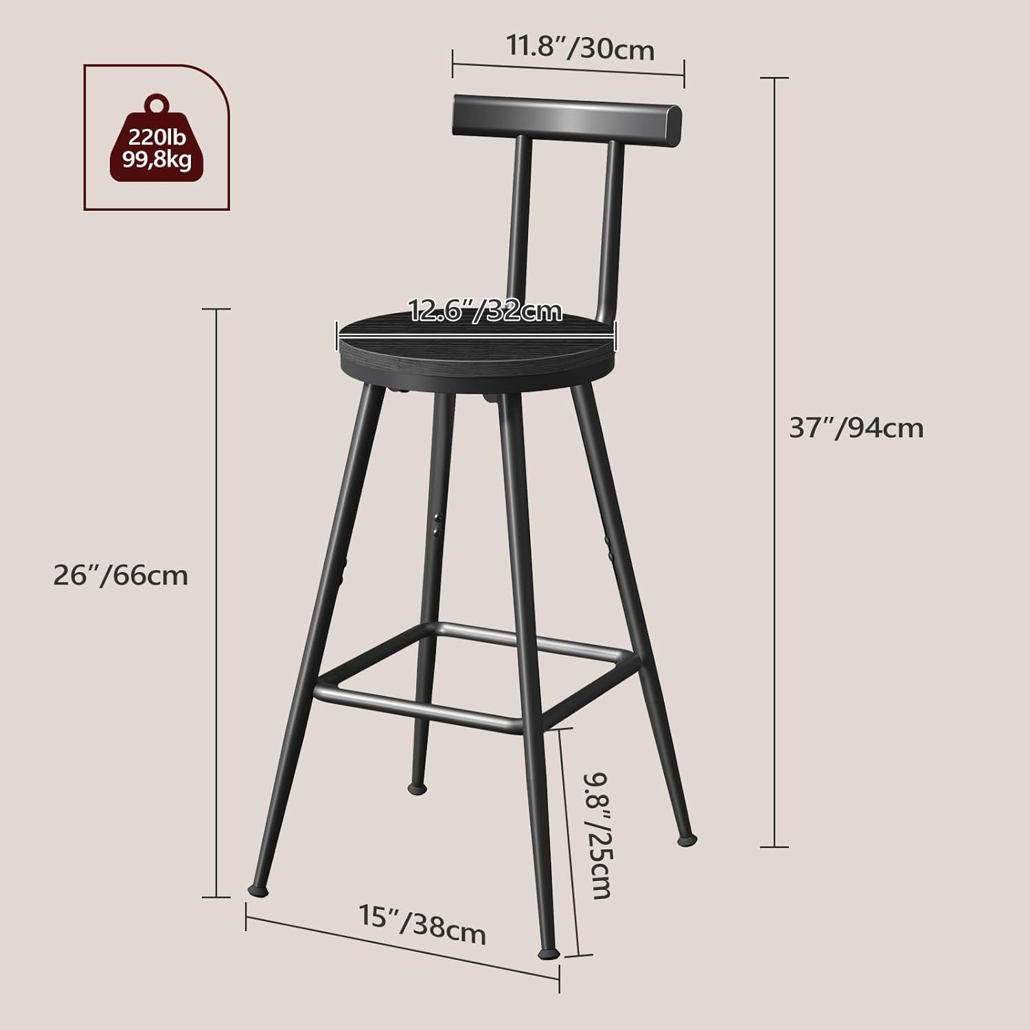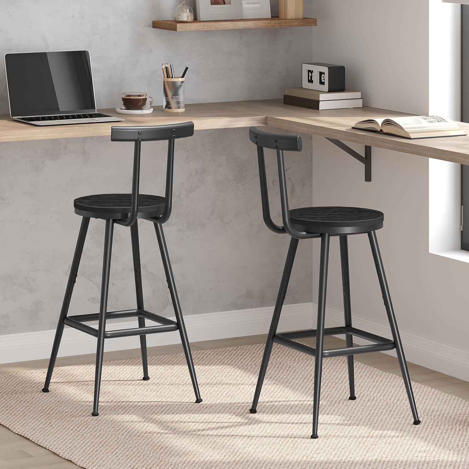 Bar Stools, Set of 2 Bar Chairs with Backrest and Footrest, 26" Tall Counter Stools, Metal Frame, Adjustable Feet, Easy Assembly, for Kitchen, Living Room, Pub, Black BAHB6001