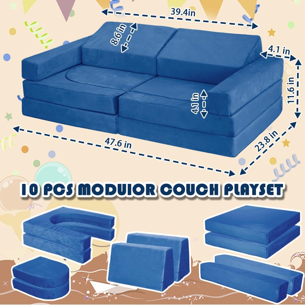 Modular Kids Play Couch Convertible Building Fort Sofa and Cushion 10Pcs Child DIY Floor Sofa for Sleeping Playroom Bedroom for Boys and Girls (Blue)