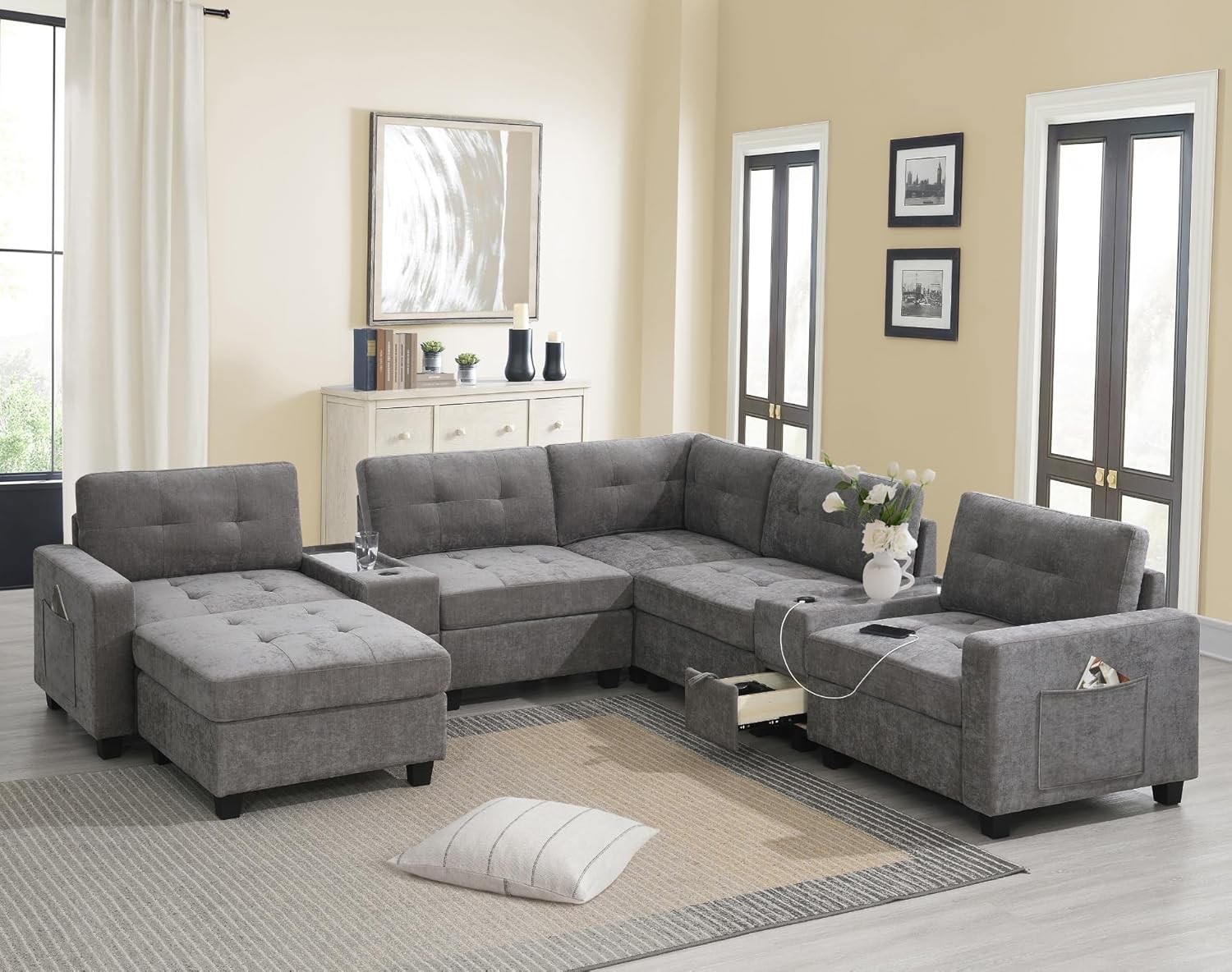 Merax 104 * 104" Chenille Sectional Couches with 2 Acrylic Consoles, Upholstered Modular Tufted Sofa Chaise with Ottoman, Storage Drawers, Pockets, USB Charger & Cup Holders for Living Room Apartment