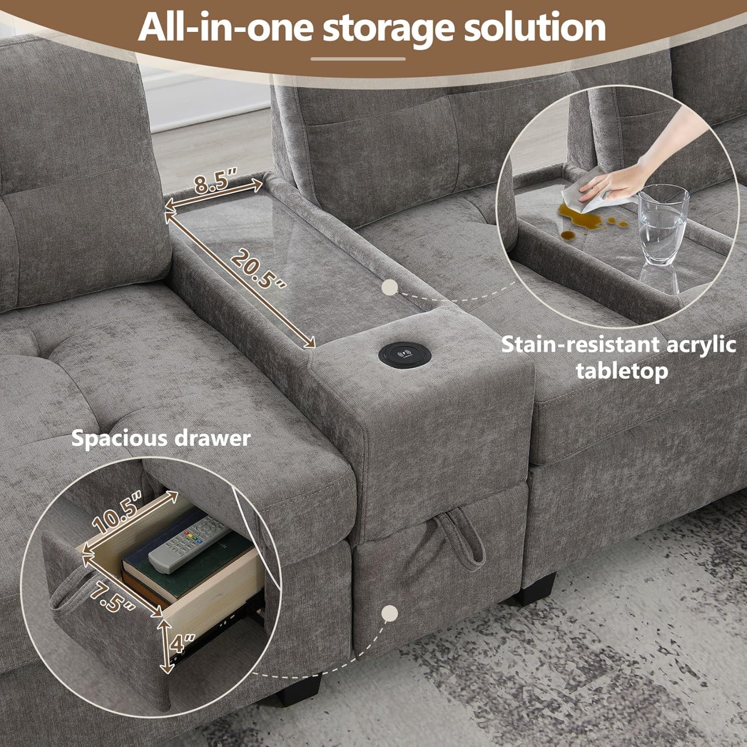 - 【Wired and Wireless Charging】 The Sectional Couch sofa features both wired and wireless charging capabilities, allowing you to easily charge your devices without needing extra cables or external chargers. Simply place your smartphone or tablet on the integrated charging pad, and you can stay powered up while relaxing on the sofa. This is an ideal feature for those who enjoy using their devices without the hassle of cords.