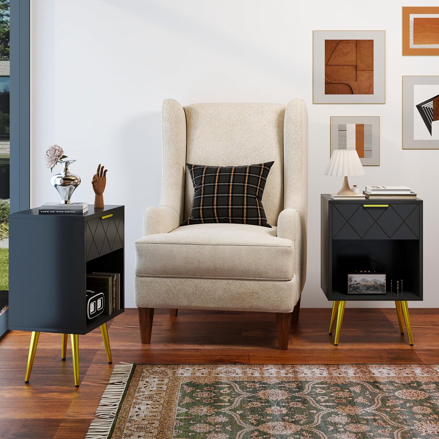 Black Nightstand, Bedside Table with Storage Drawer and Open Wood Shelf, Side Table with Gold Legs, Modern Style Night Stand End Table Drawer Dresser for Living Room Bedroom MLBZ19B