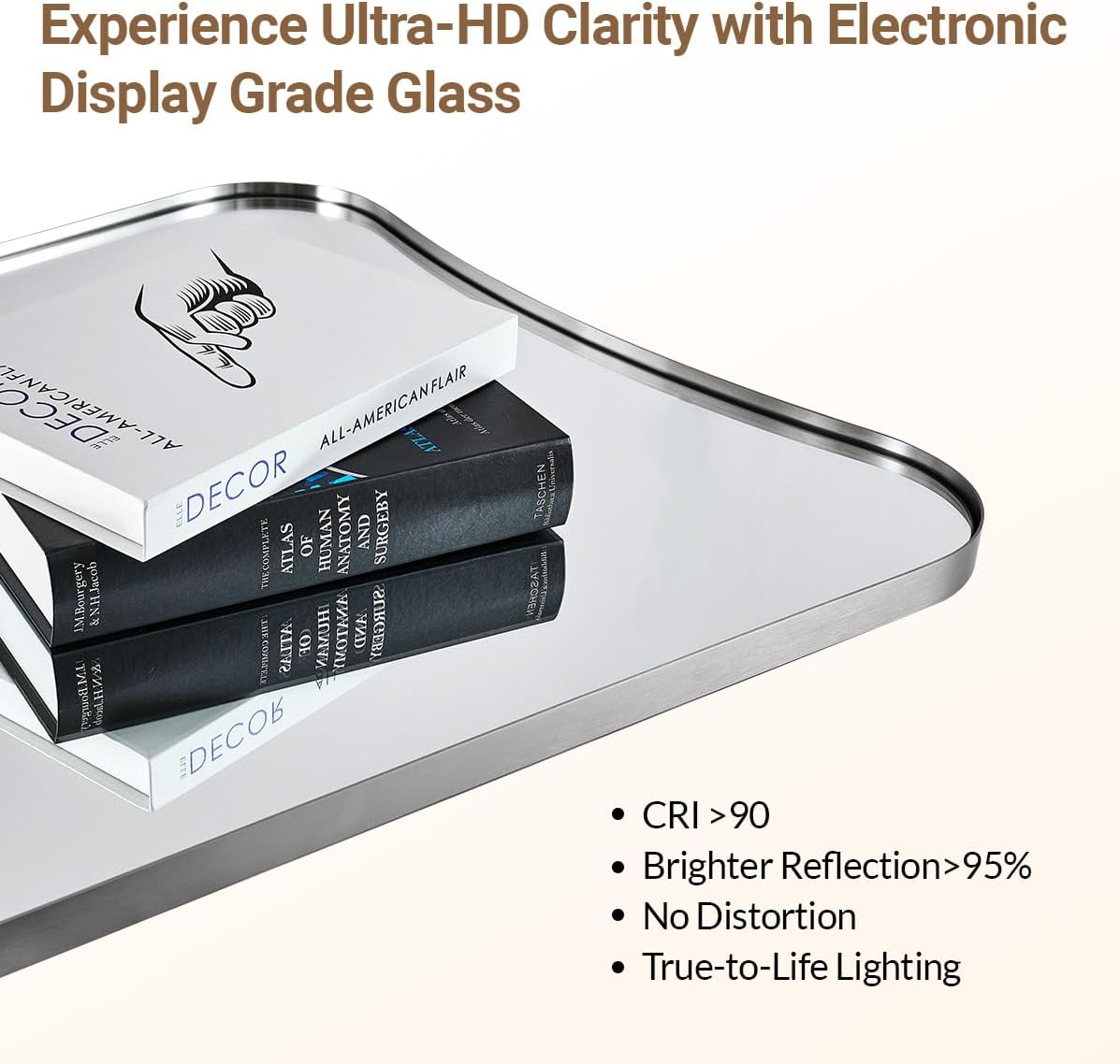- 【Rust-Proof Stainless Steel Frame】: Crafted from rust-resistant stainless steel, this brushed nickel mirror offers enhanced stability and a longer lifespan. Shatterproof 4mm HD glass is supported by a 9mm MDF backboard (most others just 3mm ), surrounded by a 1/17" gap with the unique curved corner design to give a seamless finish