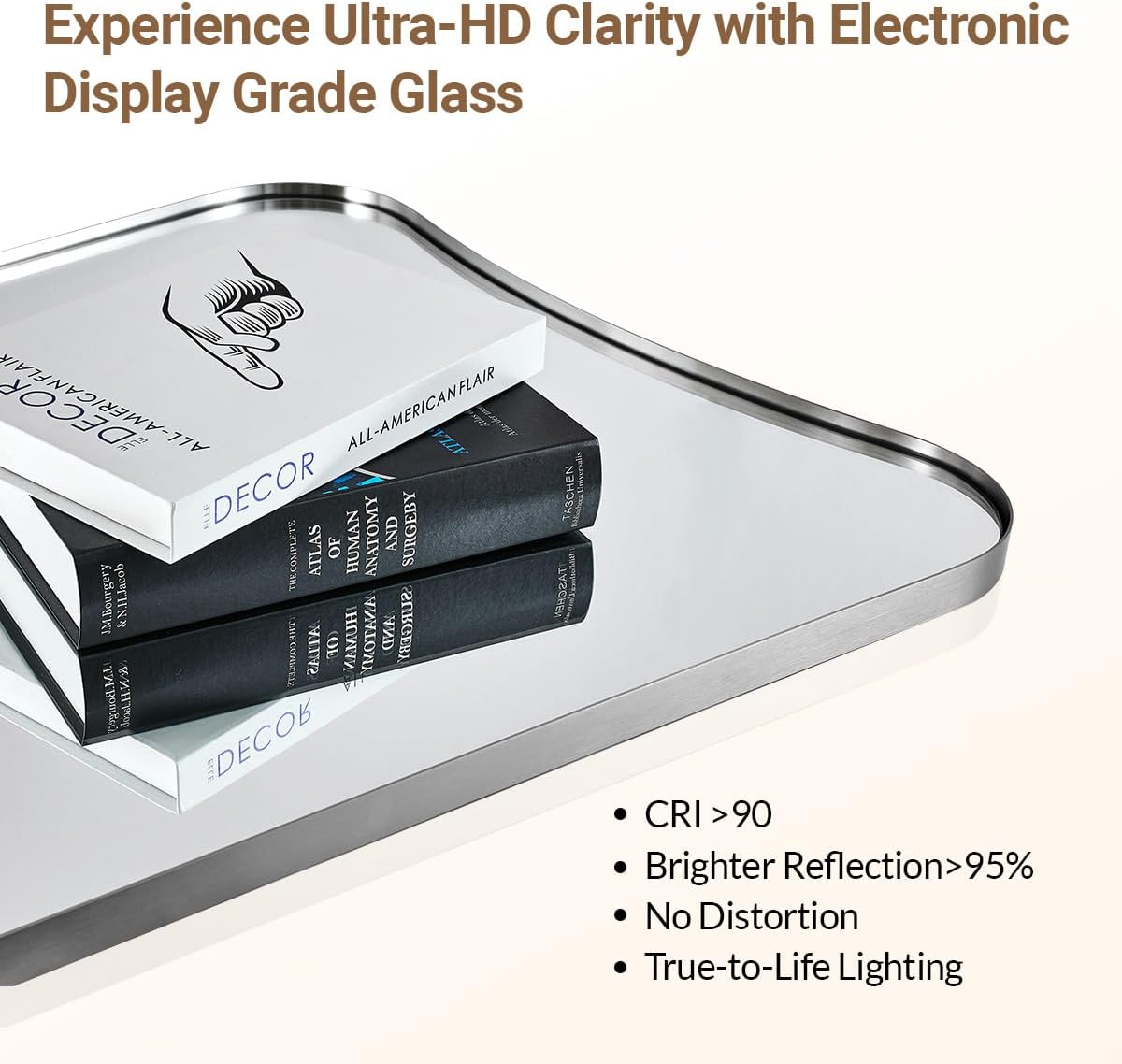 - 【Rust-Proof Stainless Steel Frame】: (N.W:19.3LBS). Crafted from stainless steel with oxidation-resistant properties, this 24x32-inch wall mirror offers enhanced stability and a longer lifespan. Shatterproof 4mm HD glass is supported by a 9mm MDF backboard (most others just 3mm ), surrounded by a 1/17" gap with the unique curved corner design to give a seamless finish