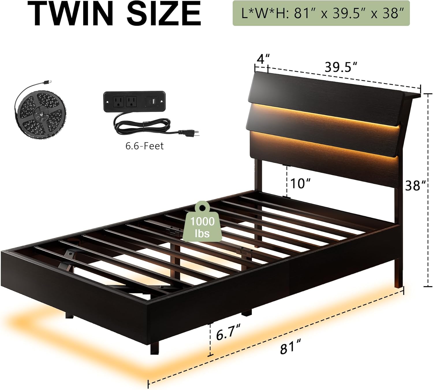 Feonase Twin Floating Bed Frame with Led Lights and Charging Station, Wood Twin Size Bed Frame with Storage Headboard, Heavy Duty Metal Slats, No Box Spring Needed, Easy Assembly, Black