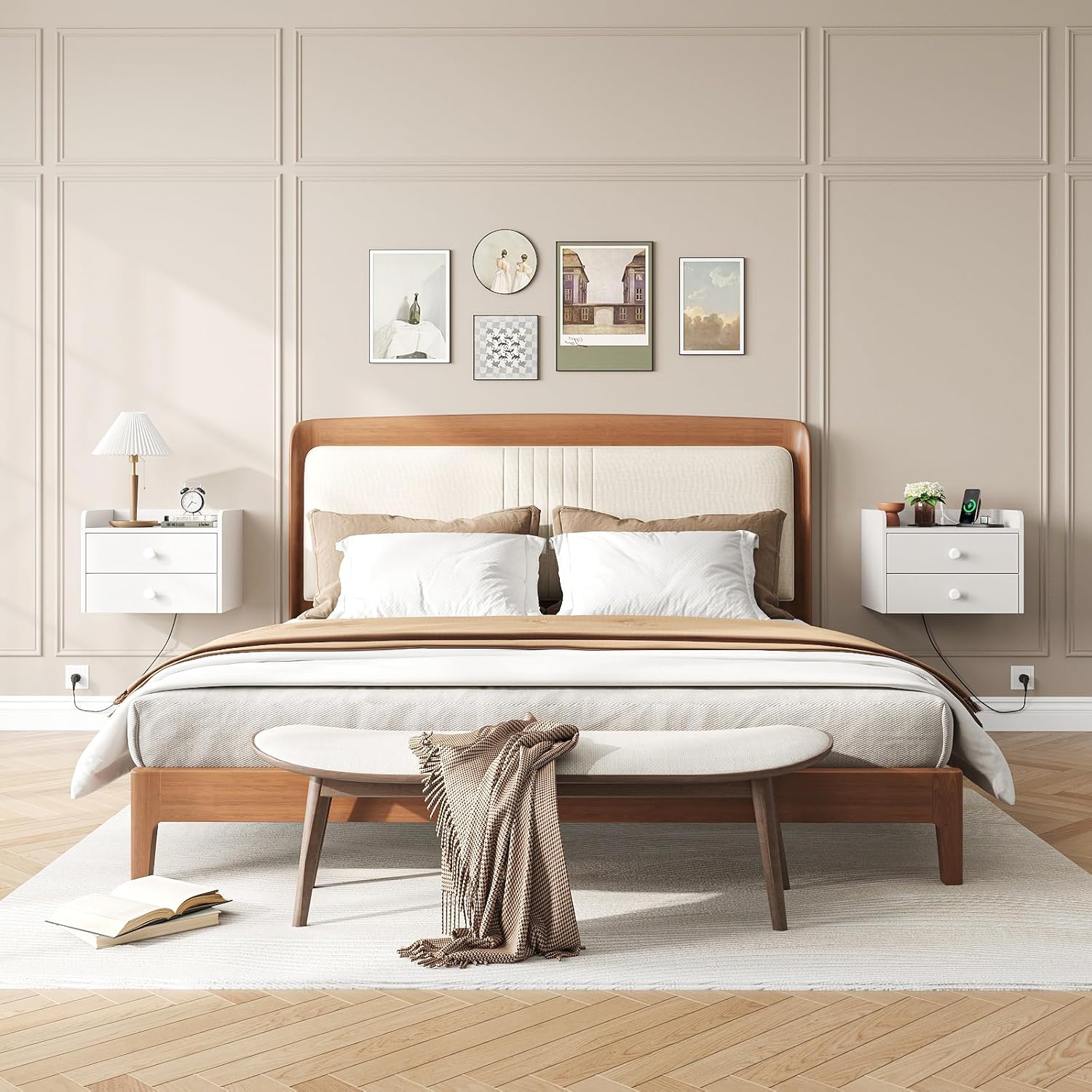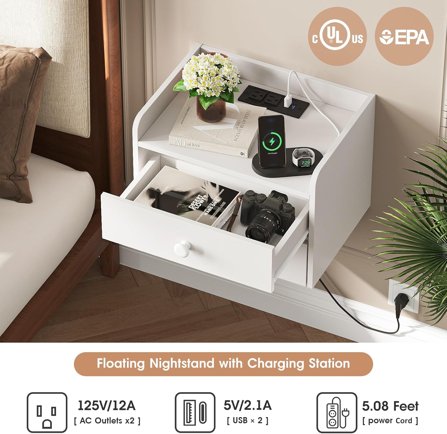 - 【Built-in Charging Station】 Set of 2 suspension nightstands with charging station, AC power (2 AC outlets + 1 USB port + 1 TPC port).You can easily charge your devices while keeping them close by. Plus, with its space-saving floating design, you'll have plenty of room to move around.