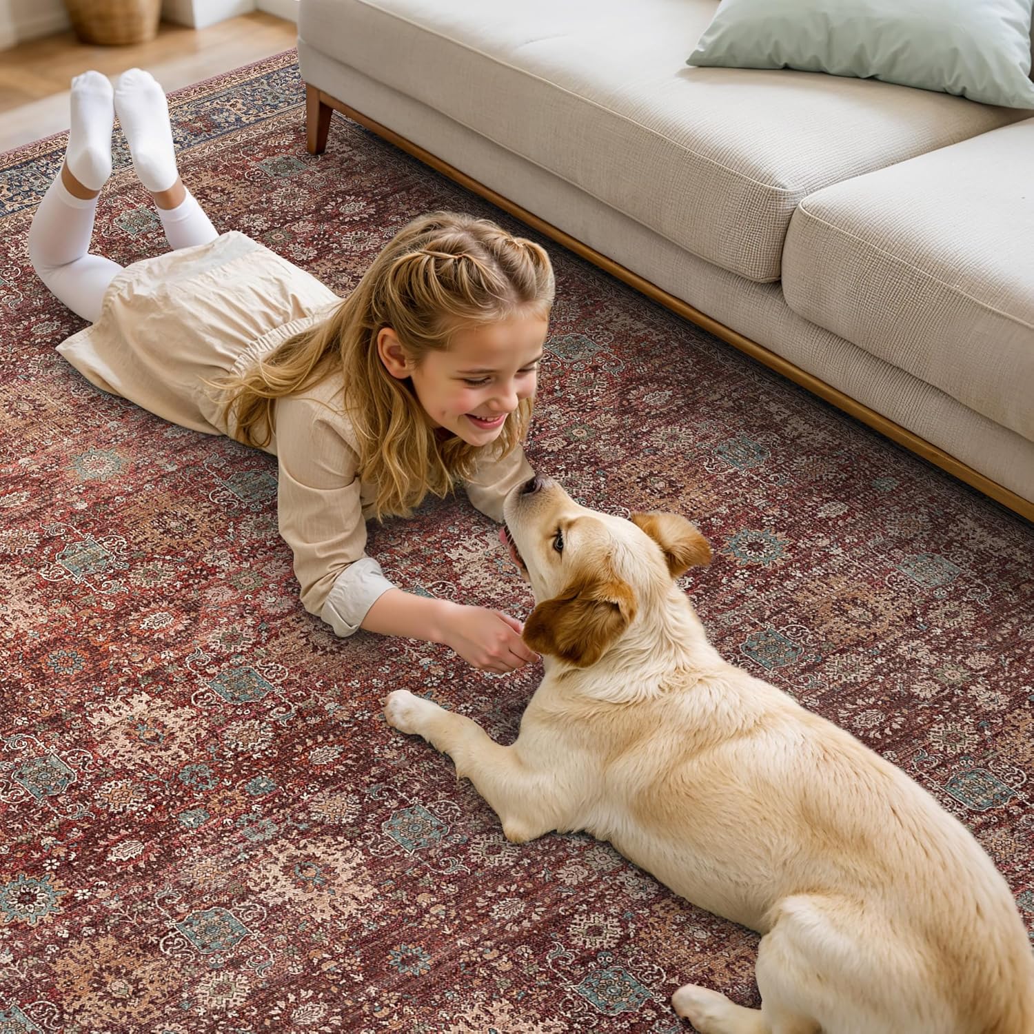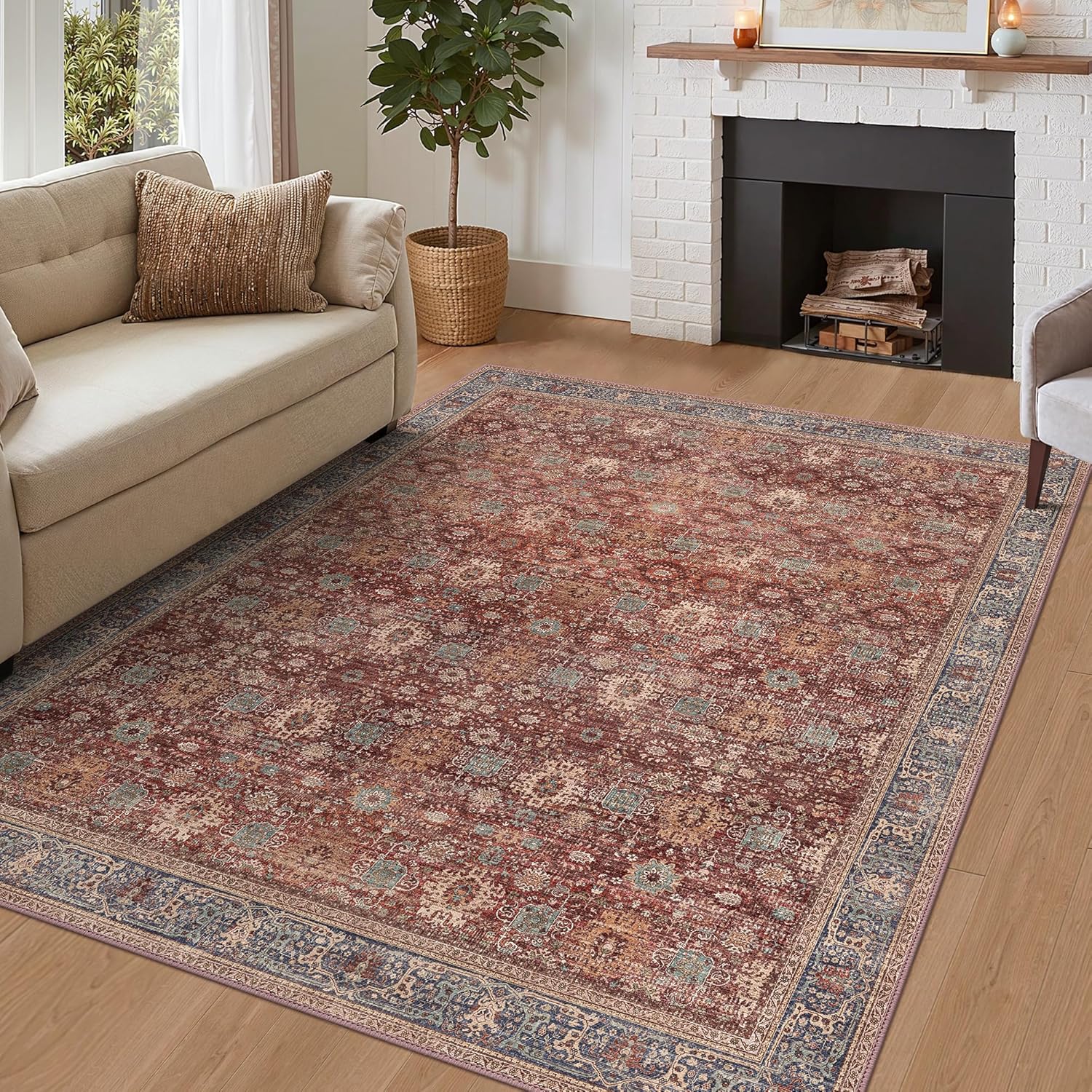 8X10 Area Rugs Machine Washable Rugs for Living Room, Vintage Boho Large Rugs for Bedroom Dining Room, Non Slip Indoor Soft Distressed Lightweight Thin Low Pile Carpet, Red Brown