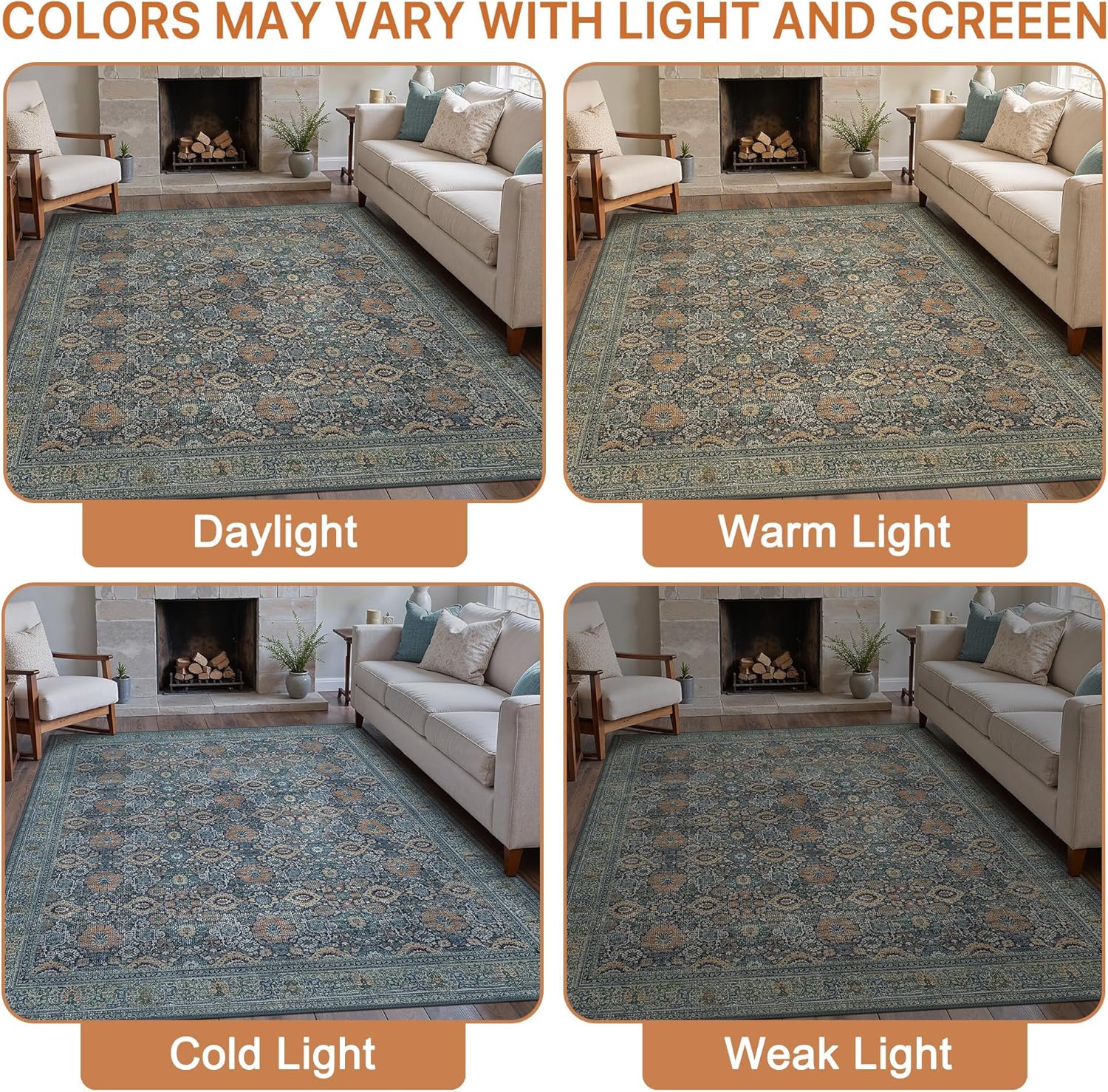 8X10 Area Rugs Machine Washable Rugs for Living Room, Vintage Boho Large Rugs for Bedroom Dining Room, Non Slip Indoor Soft Distressed Lightweight Thin Low Pile Carpet, Beige Blue Grey