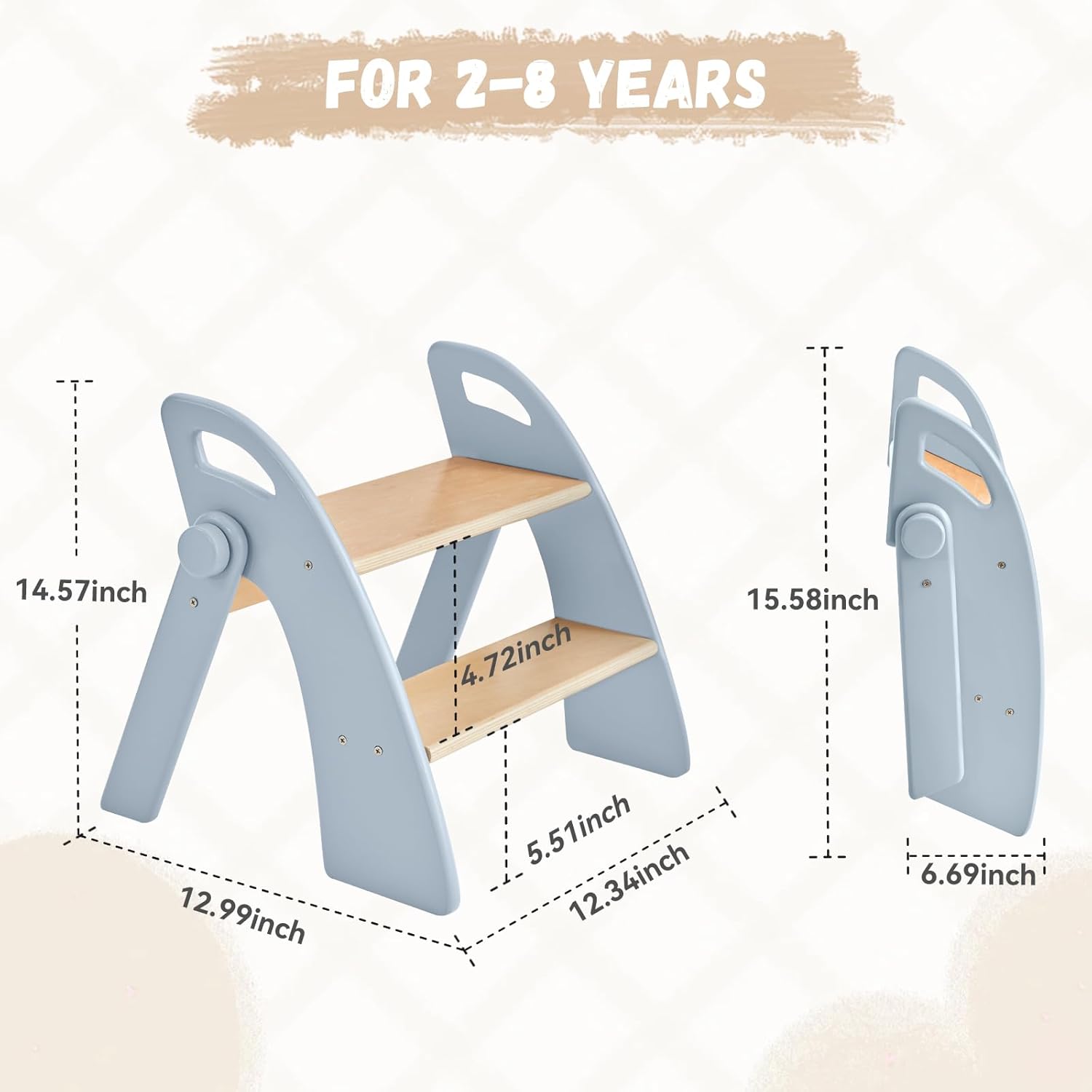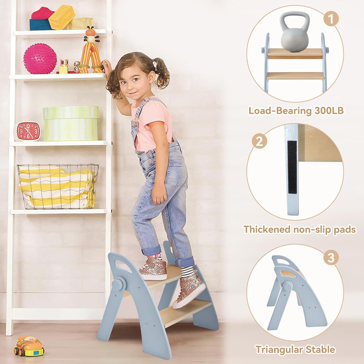 Wooden 2 Step Stool for Kids Bathroom Sink Foldable Anti-Slip 2-Step for Toilet Potty Training, Child Stepping Stool for Kitchen Nursery Bedroom, Sturdy Non Slip Adult Stool for Closet Blue