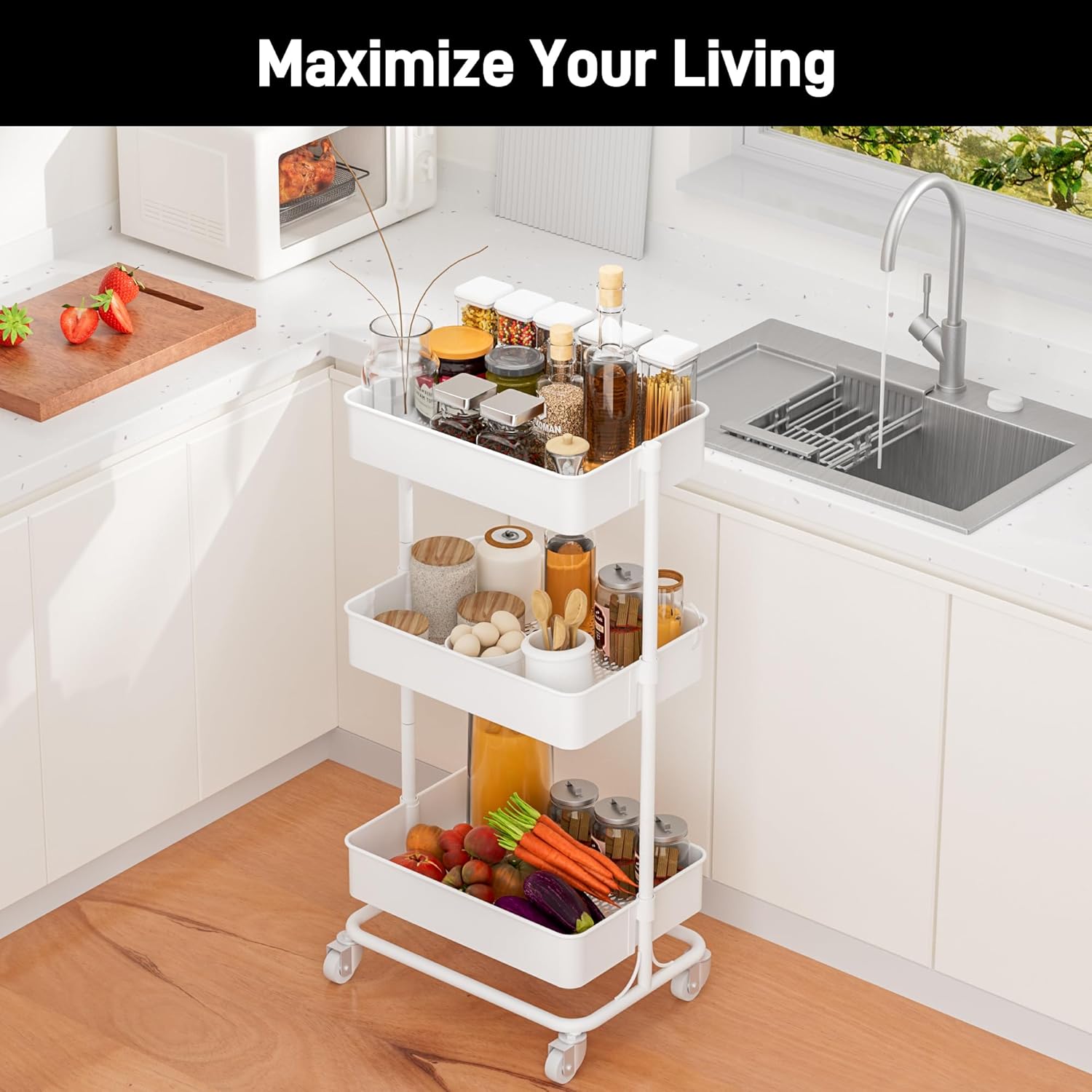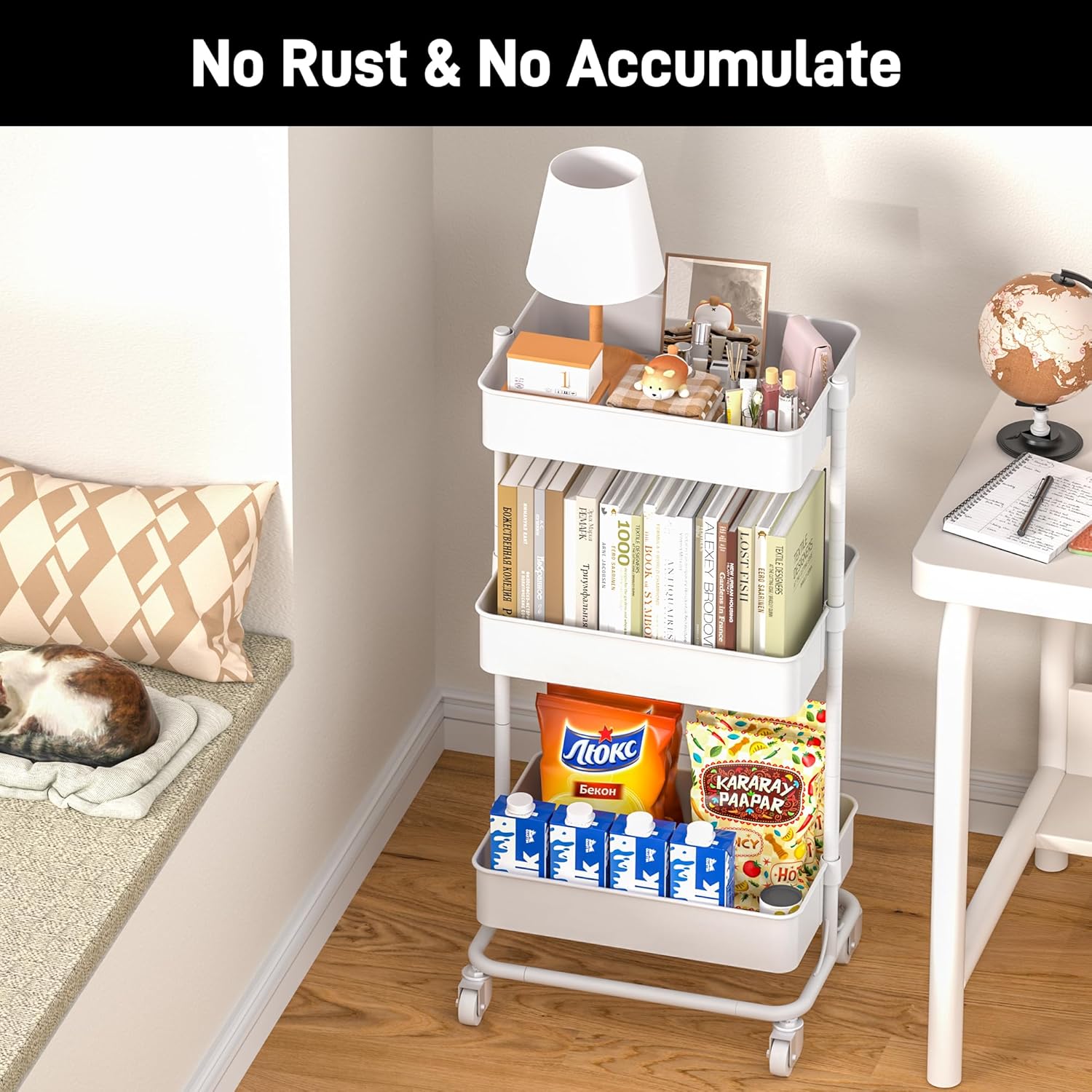 TECBOT 3 Tier Metal Rolling Cart with Wheels, Utility Storage Cart with Handle and Lockable Casters, Storage Basket Organizer Shelves, Easy Assemble for Kitchen, Living Room, Office, Nursery, White
