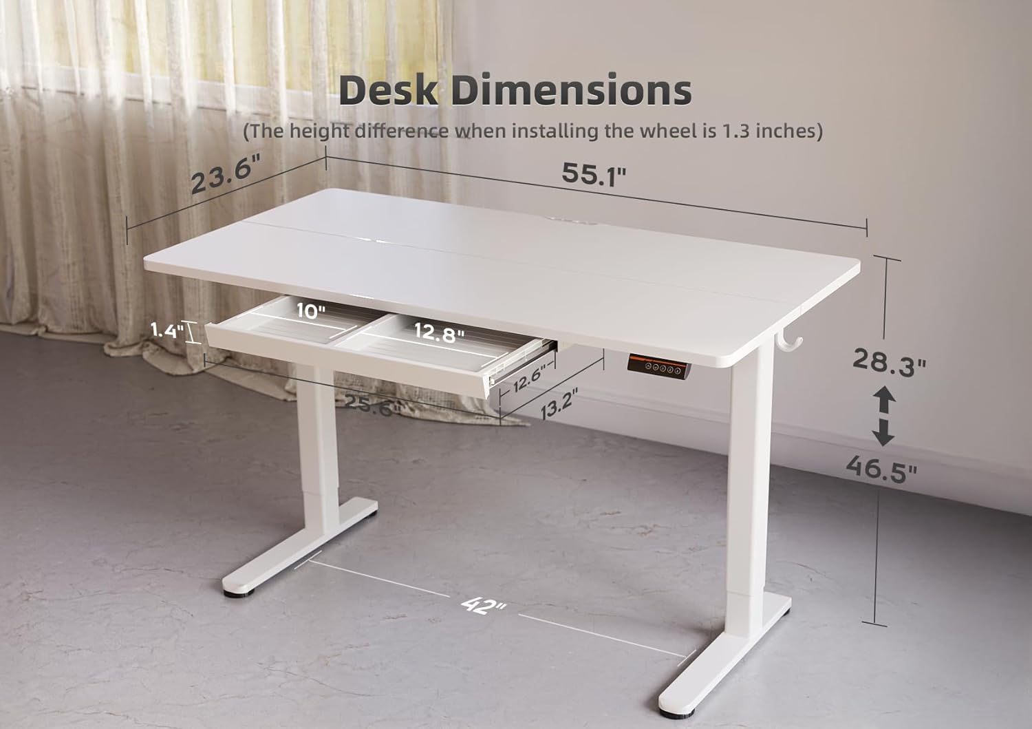- Practical Storage Drawer: Adjustable standing desk with storage drawers help keep the desktop tidy, provide ample storage space, and meet various home office needs. The drawer size is 25.6 x 12.6 inches, the maximum load capacity is 11 lbs