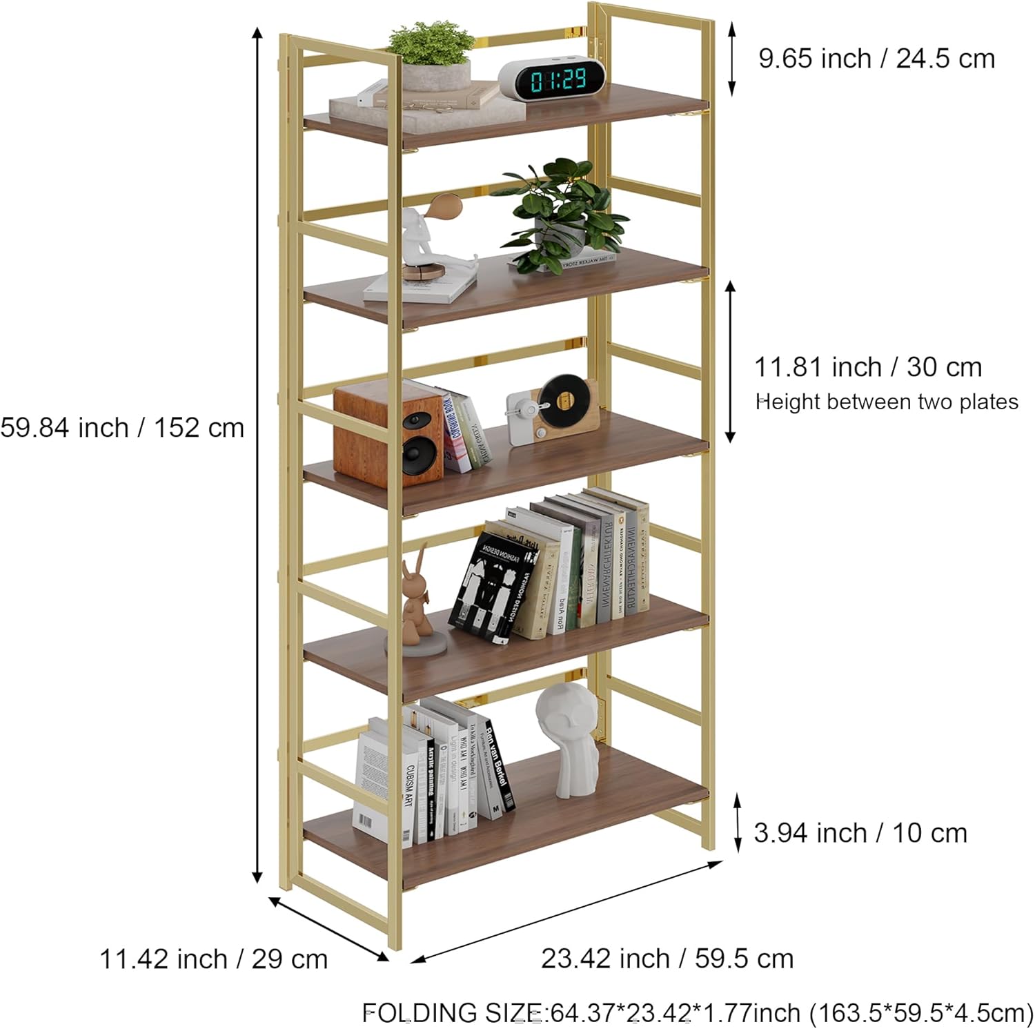 BHG Vintage Multifunctional Folding Bookshelf,5 Tier No-Assembly Plant Stand Storage Rack Shelves for Home Office (Brown&Gold, 5-Tier)