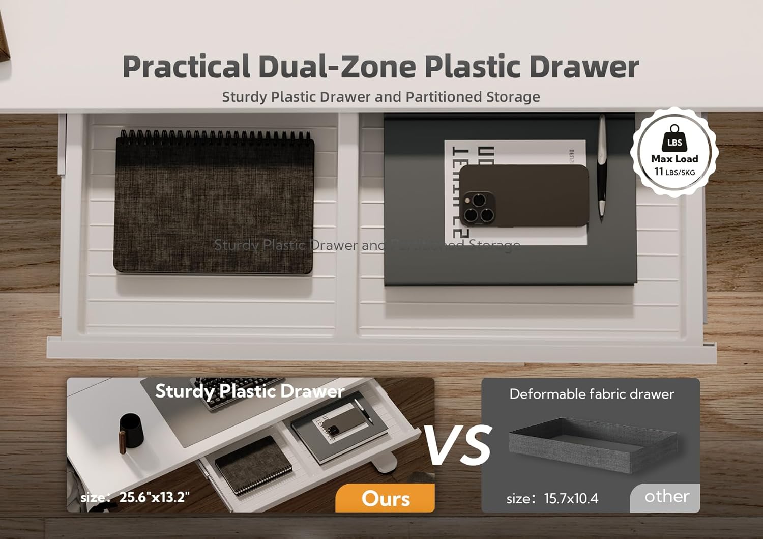 - Practical Storage Drawer: Adjustable standing desk with storage drawers help keep the desktop tidy, provide ample storage space, and meet various home office needs. The drawer size is 25.6 x 12.6 inches, the maximum load capacity is 11 lbs
