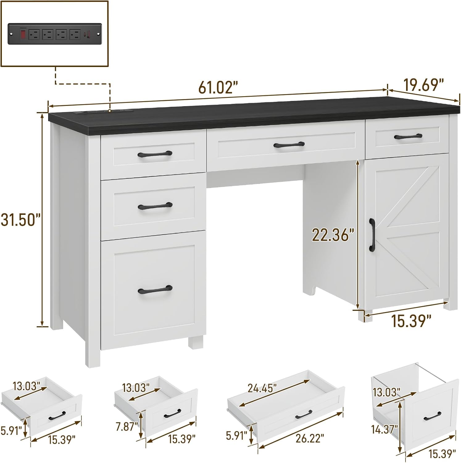 Farmhouse 61'' Executive Desk with 5 Drawers, Rustic Office Desk Computer Desk with Charging Station, File Drawers and Storage Cabinet, Wood Workstation for Home Office and Study.(Black Top)