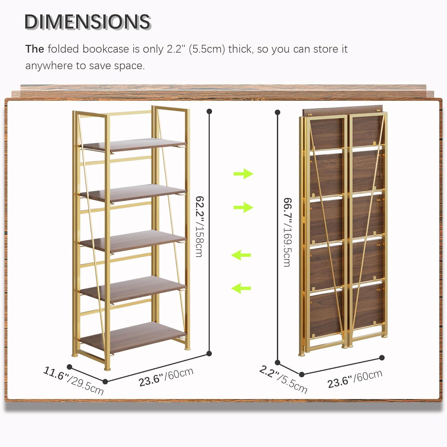 4NM No Assembly Folding Bookshelf, 5-Shelf 62.2" H Collapsible Foldable Bookcase Storage for Small Spaces, Brown and Golden