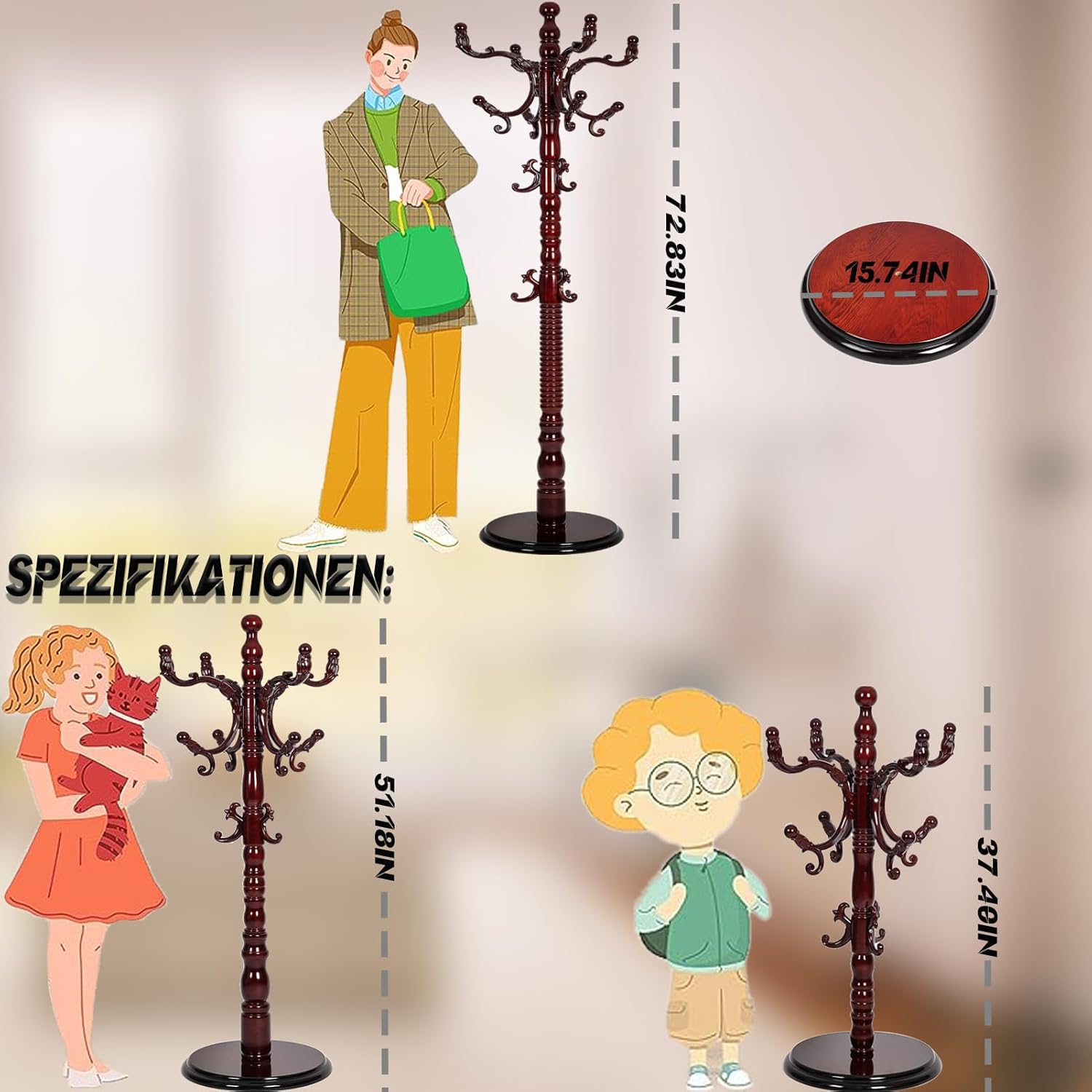73 in Wood Coat Rack, Coat Rack Freestanding with Stable Round Base, Adjustable Height Tree Coat Racks Stand for Home Bedroom Office Hallway Entryway (Redwood)