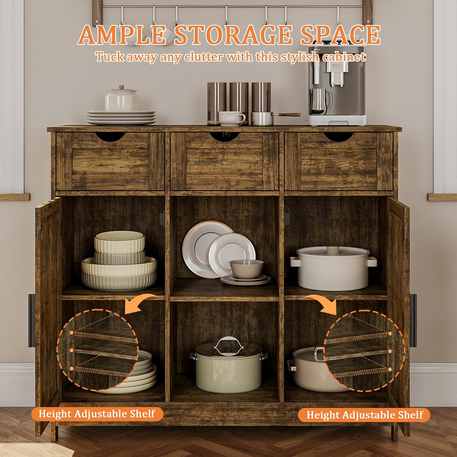 Storage Cabinet, Coffee Bar Cabinet with 2 Adjustable Shelves, 3 Drawers, and 2 Doors, for Bathroom, Kitchen, Living Room (Retro)