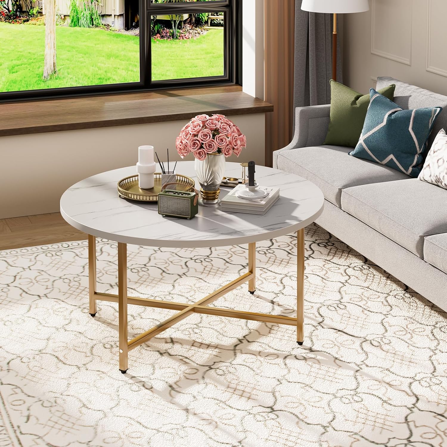 Round Coffee Table, 31.5" Circle Coffee Table, Coffee Tables Living Room, Gold Coffee Table Round for Indoor & Outdoor Use, Office, Patio or Garden, Large White & Gold (31.5" D x 17.7" H)