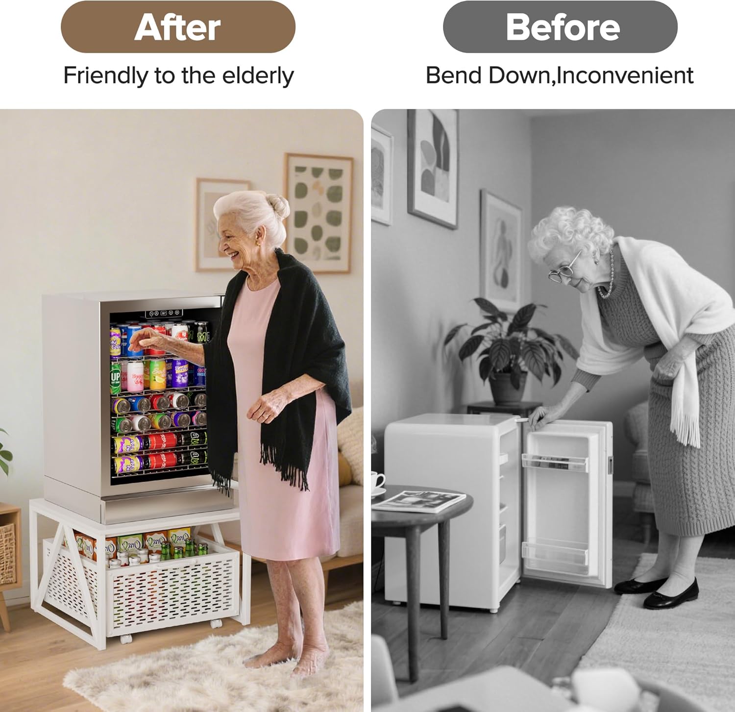 - Bend-Free:Eliminate back and waist strain! This fridge table lifts fridges, freezers, small washing machines, toasters, microwaves & other small appliances off ground, preventing stooping when accessing your mini fridge cabinet. Critical elder-friendly design protects joints, especially beneficial for over mini fridge storage retrieval