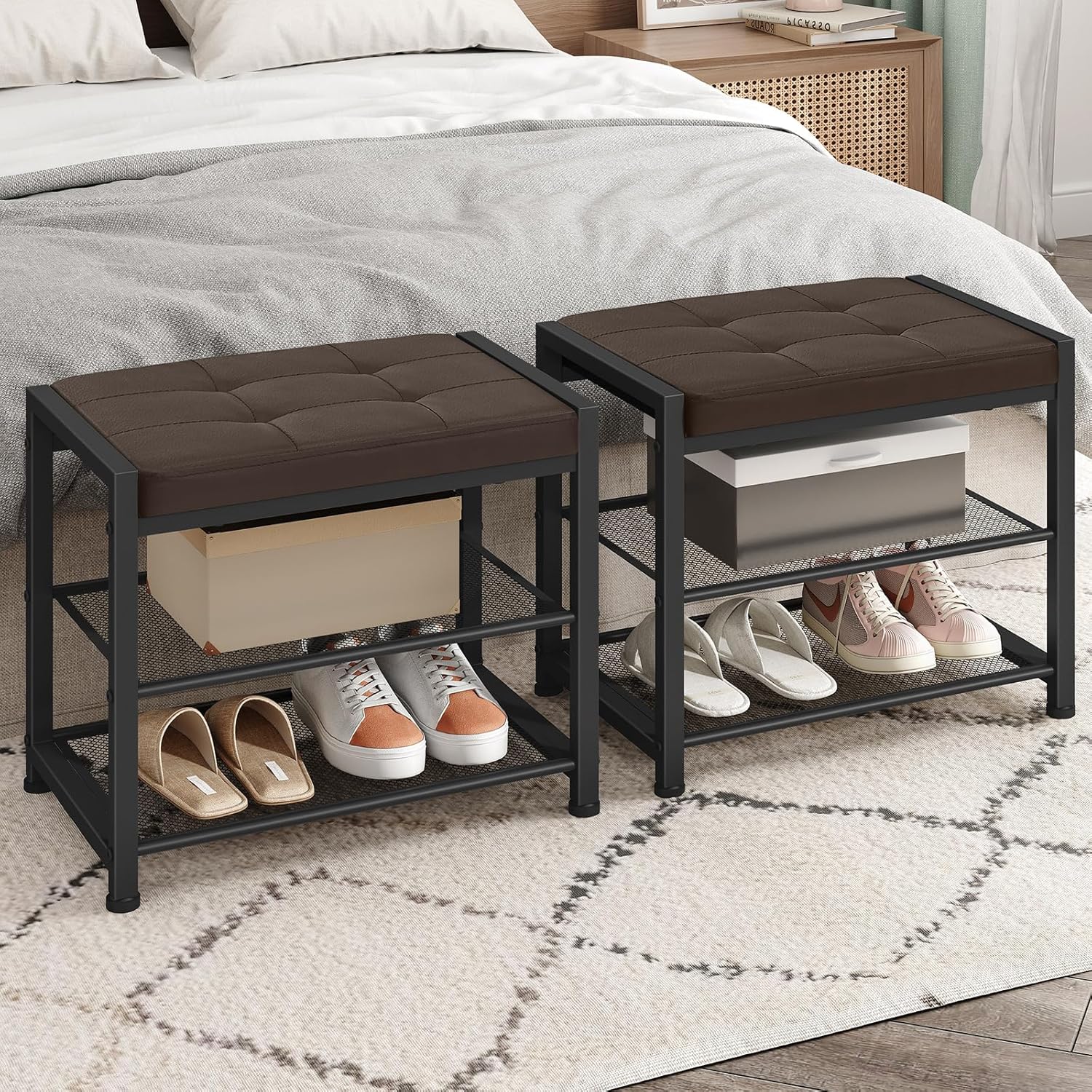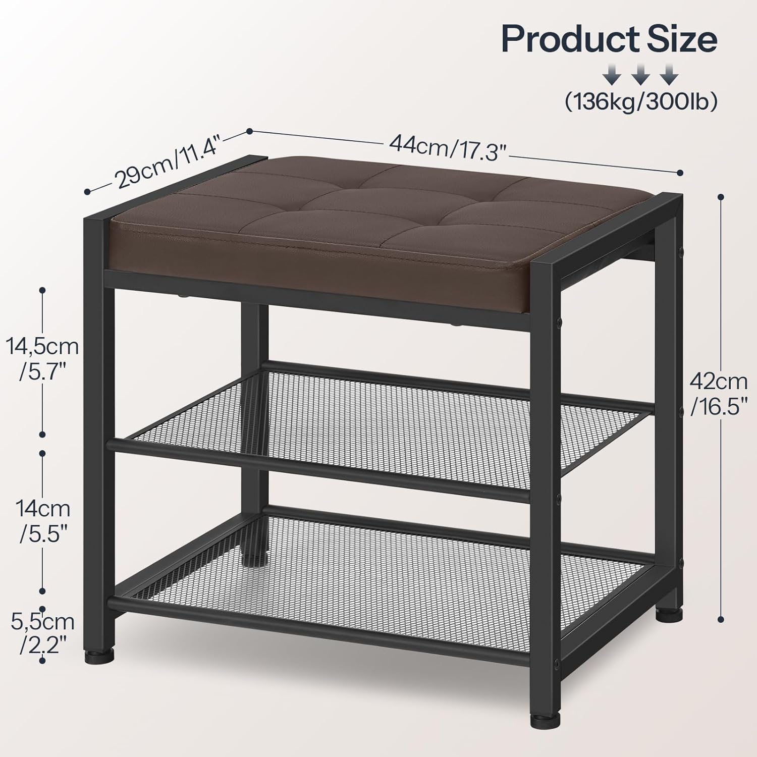 HOOBRO Small Shoe Bench, 3-Tier Shoe Rack, Shoe Storage Bench with PU Seat Cushion, Entryway Shoe Rack Bench with Metal Mesh Shelves, Freestanding Shoe Organizer for Hallway, Brown CB33HX01