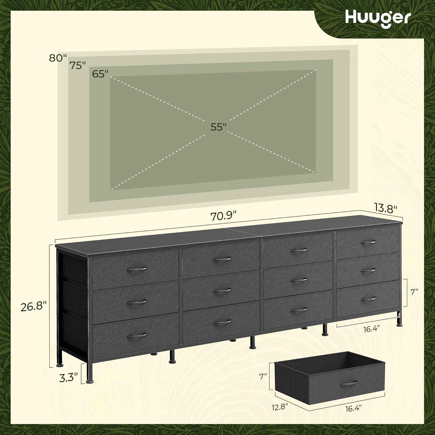 Huuger 70 Inch Black Dresser for Bedroom, TV Stand for 65, 75, 80 Inch TV, 12 Fabric Drawer Long Dresser, Wide Chest of Drawer, Storage Units for Living Room