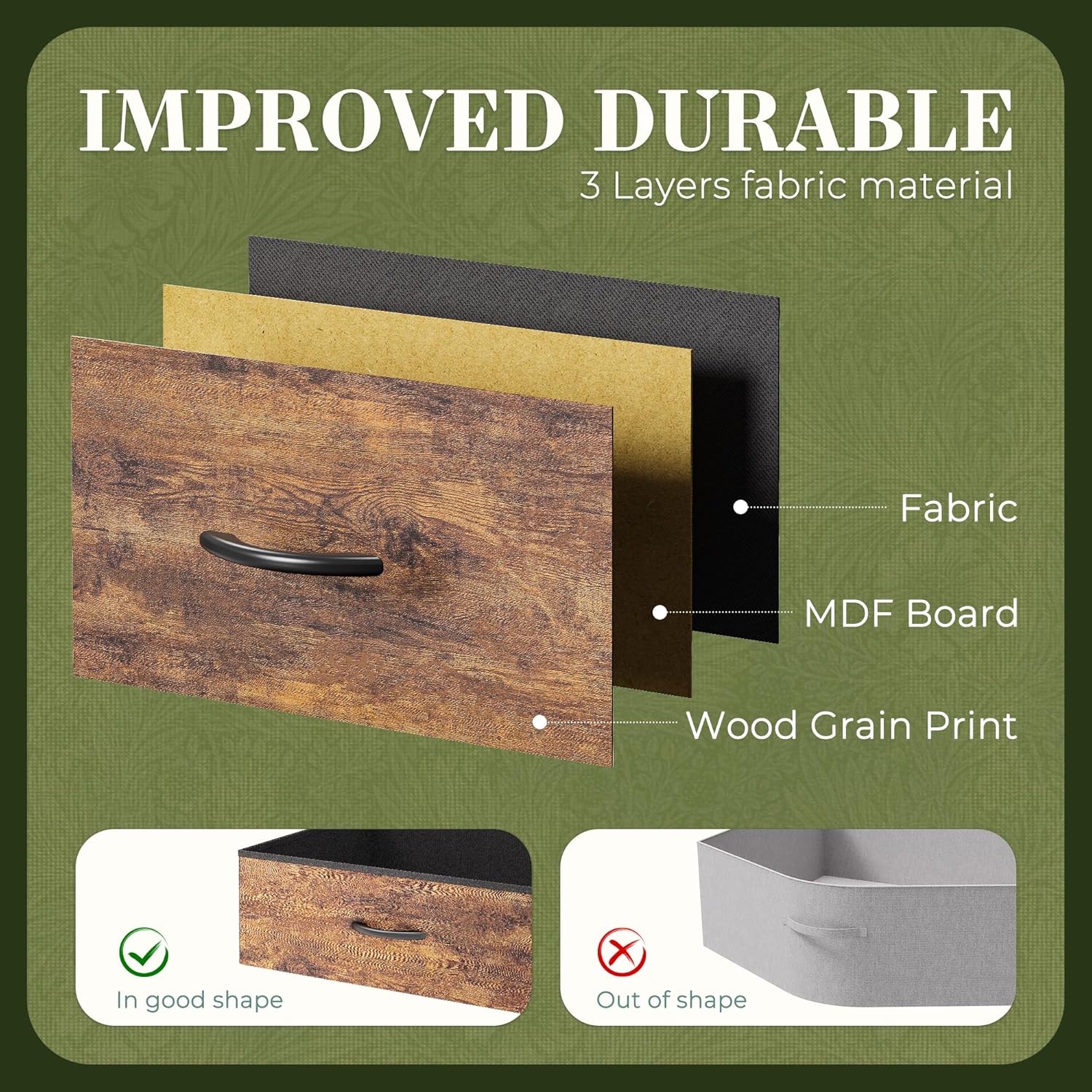 - 【Sturdy, User-friendly Design】Built with a durable wooden top, high-quality fabric drawers, and a sturdy metal frame, this rustic dresser is designed to last. The anti-tip kit ensures safety for families, while the smooth-glide drawers make it easy for little hands to access items. Plus, 8 adjustable feet keep it stable on uneven floors and protect your surfaces from scratches