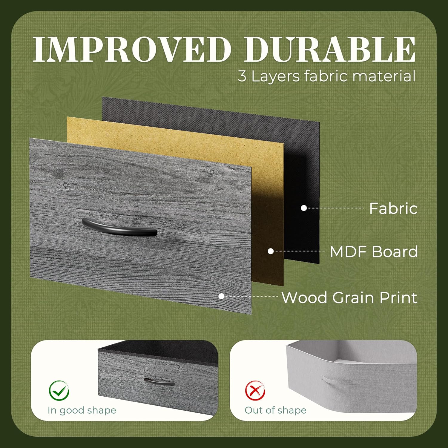 - 【Sturdy, Child-Friendly Design】Built with a durable wooden top, high-quality fabric drawers, and a sturdy metal frame, this grey dresser is designed to last. The anti-tip kit brings safety for families, while the smooth-glide drawers make it easy for little hands to access items. Plus, 8 adjustable feet keep it stable on uneven floors and protect your surfaces from scratches