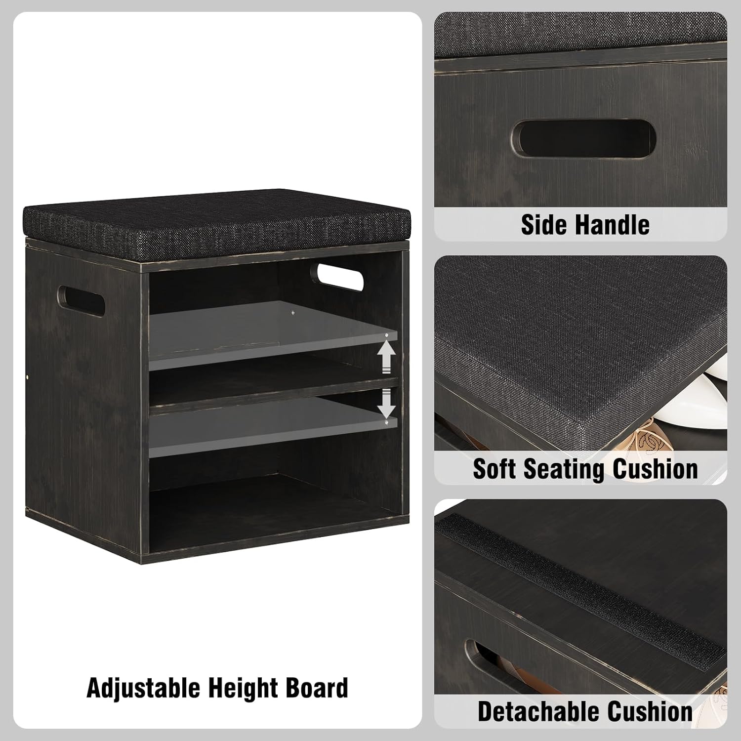 Bamboo Small Shoe Bench for Entryway 2 Tier Shoe Storage Bench with Cushion Adjustable Shoe Rack with Padded Seat for Living Room Hallway (Antique Black)
