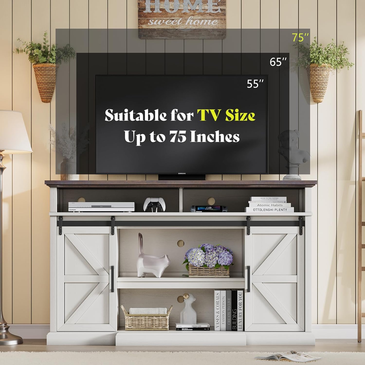 66" Farmhouse TV Stand for 75 Inch TVs, 40" Tall Entertainment Centere with Sliding Barn Doors, Rustic Media Console Table Storage Cabinet with Adjustable Shelves, Living Room, Antique White