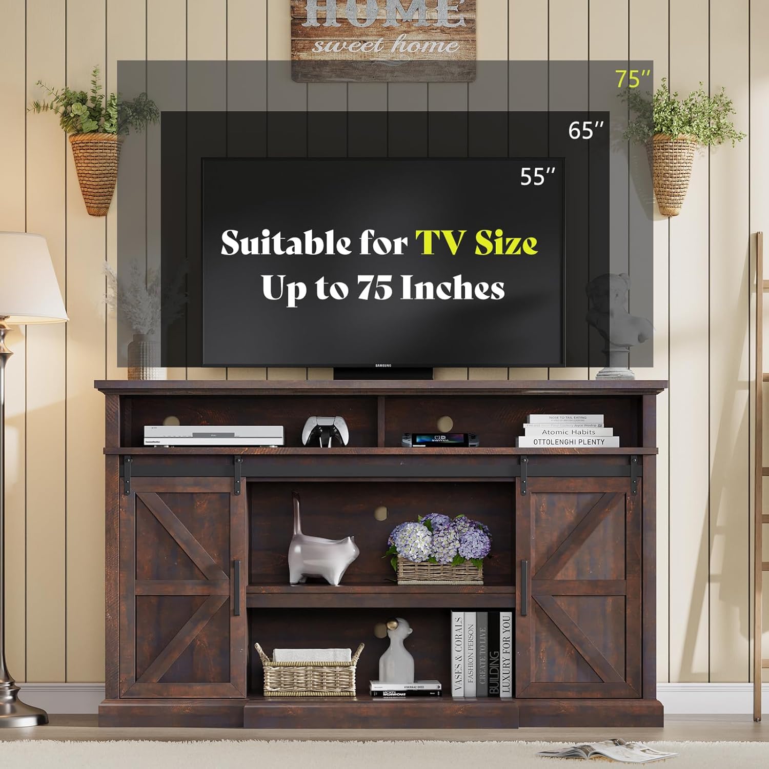 66" Farmhouse TV Stand for 75 Inch TVs, 40" Tall Entertainment Center with Sliding Barn Doors, Rustic Media Console Table Storage Cabinet with Adjustable Shelves, Living Room, Sawdust Brown